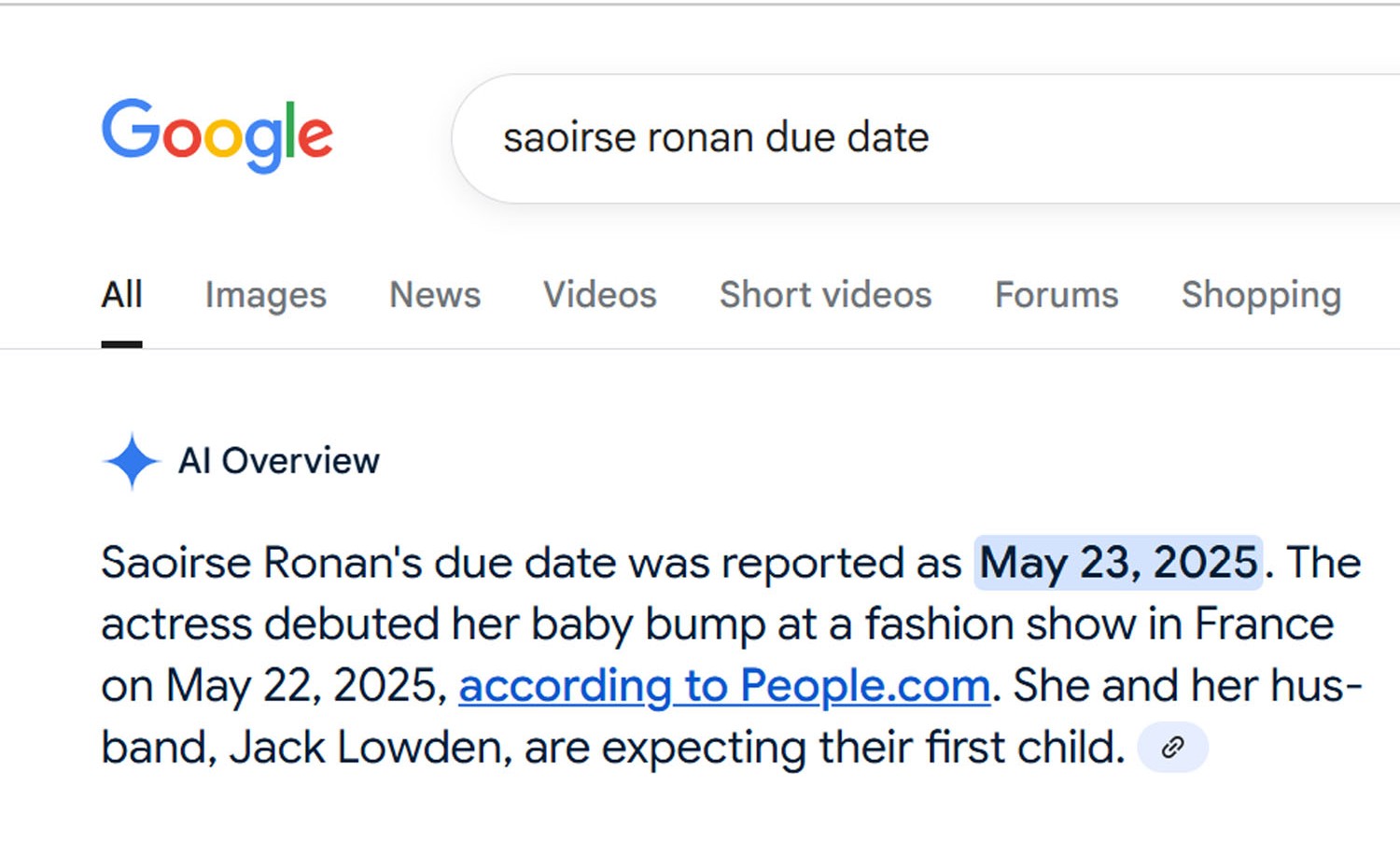 Can I just rage for a second though about AI? I googled Saoirse as I was writing this to check on whether or not she’s talked about her pregnancy and if there was any reporting about her giving birth. Look what this dumbass AI spat out: