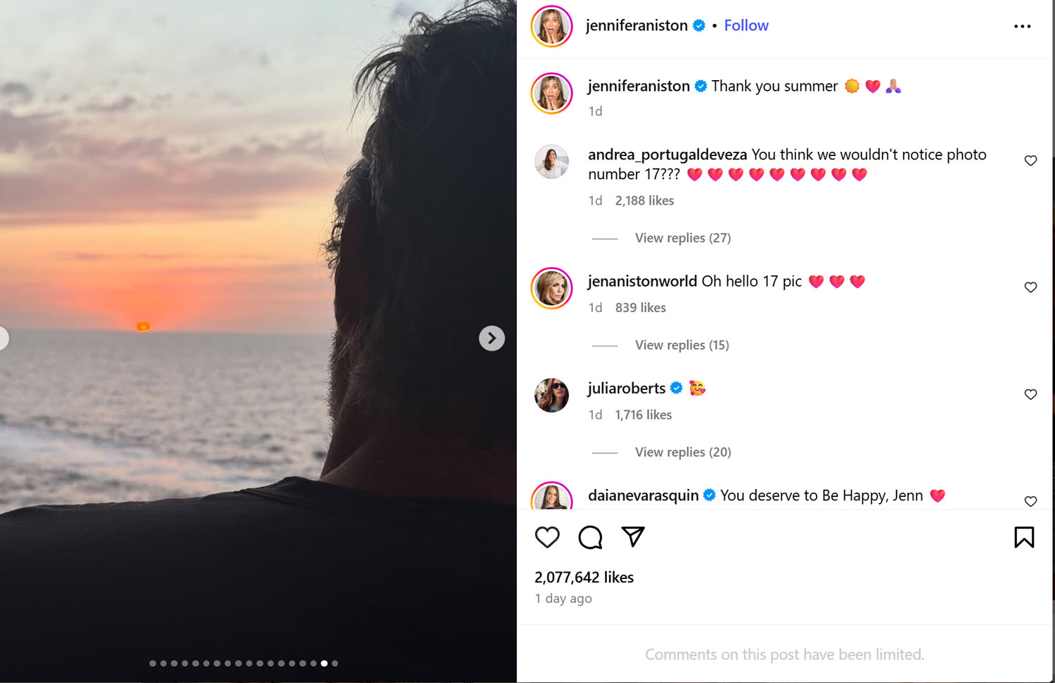 Jen is in New York this week to promote the new season of The Morning Show. The junket is today and the red carpet is tonight. Before red carpet official, though, of course there is Instagram official. And Jim showed up on her IG for the first time the other day in a carousel, the second to last photo, it’s the back of his head as the sun sets.