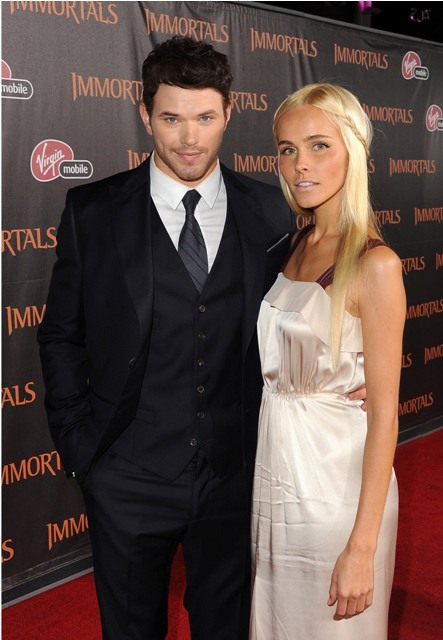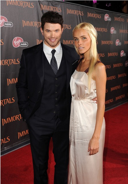 See what I mean about this material? It’s lumpy and it wrinkles. I can’t understand why you would ever encourage someone to wear it to ...anything that requires photos. The beach? Sure. To kick around in for a casual dinner? Sure? On the red carpet for the premiere of Immortals? I just find it’s so messy. Also, is it just me or does Isabel Lucas, even by Hollywood model/actress type standards, look extra extra vacant? Standing next to that cheesy f-cking bimbo Kellan Lutz doesn’t help either.