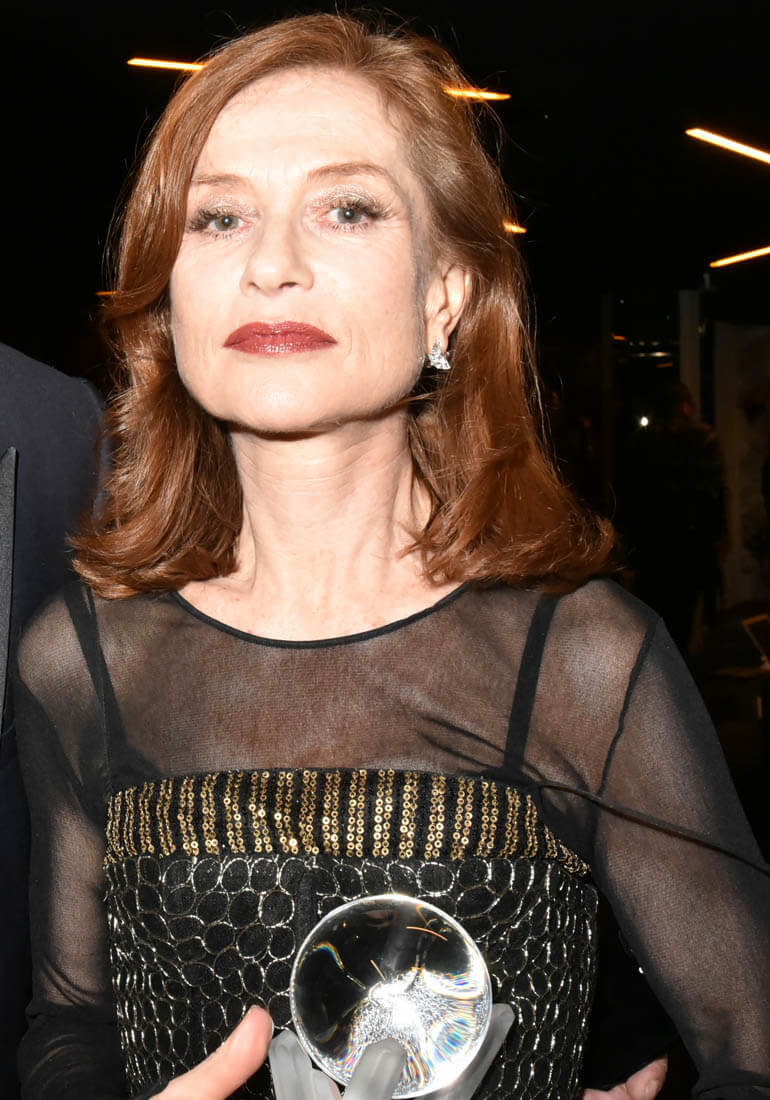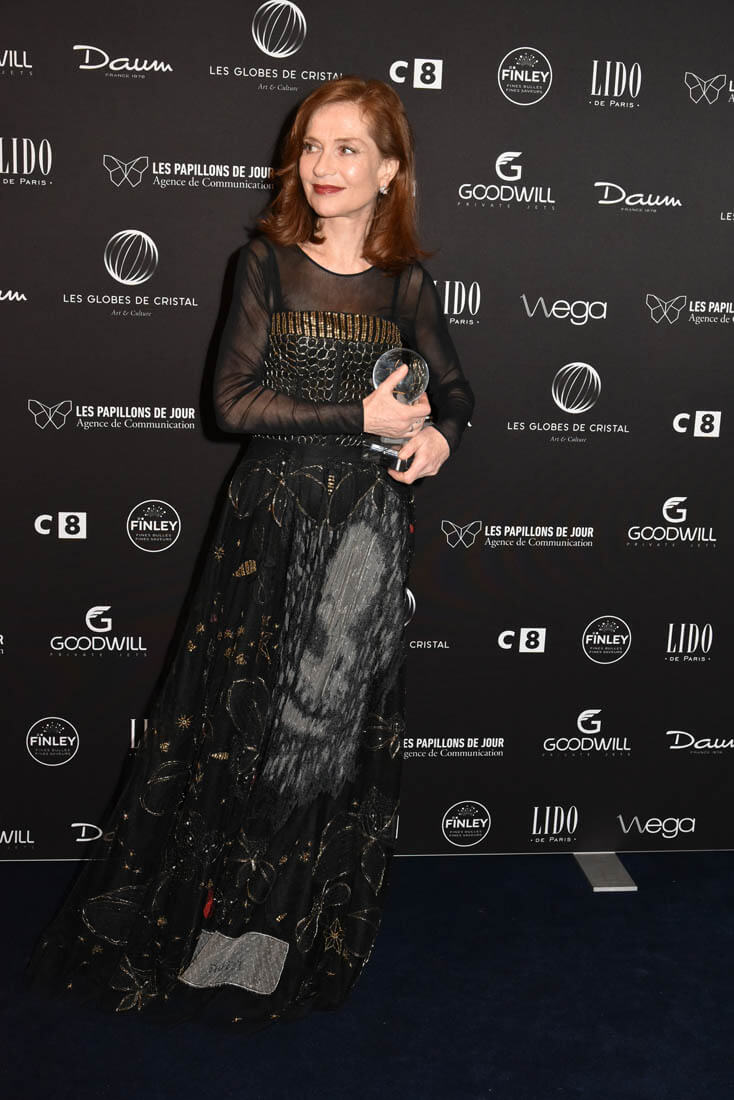 Isabelle Huppert was honoured at the Lumieres Awards last night in Paris. These are referred to as the Golden Globes of France. And you know that Isabelle upset Natalie Portman at the Golden Globes earlier this month in Hollywood. The Oscars of France are the Cesar Awards. Isabelle holds the record for most Cesar nominations. Which is why many call her the Meryl Streep of France. And she was just nominated for her first Oscar this year for her performance in Elle.