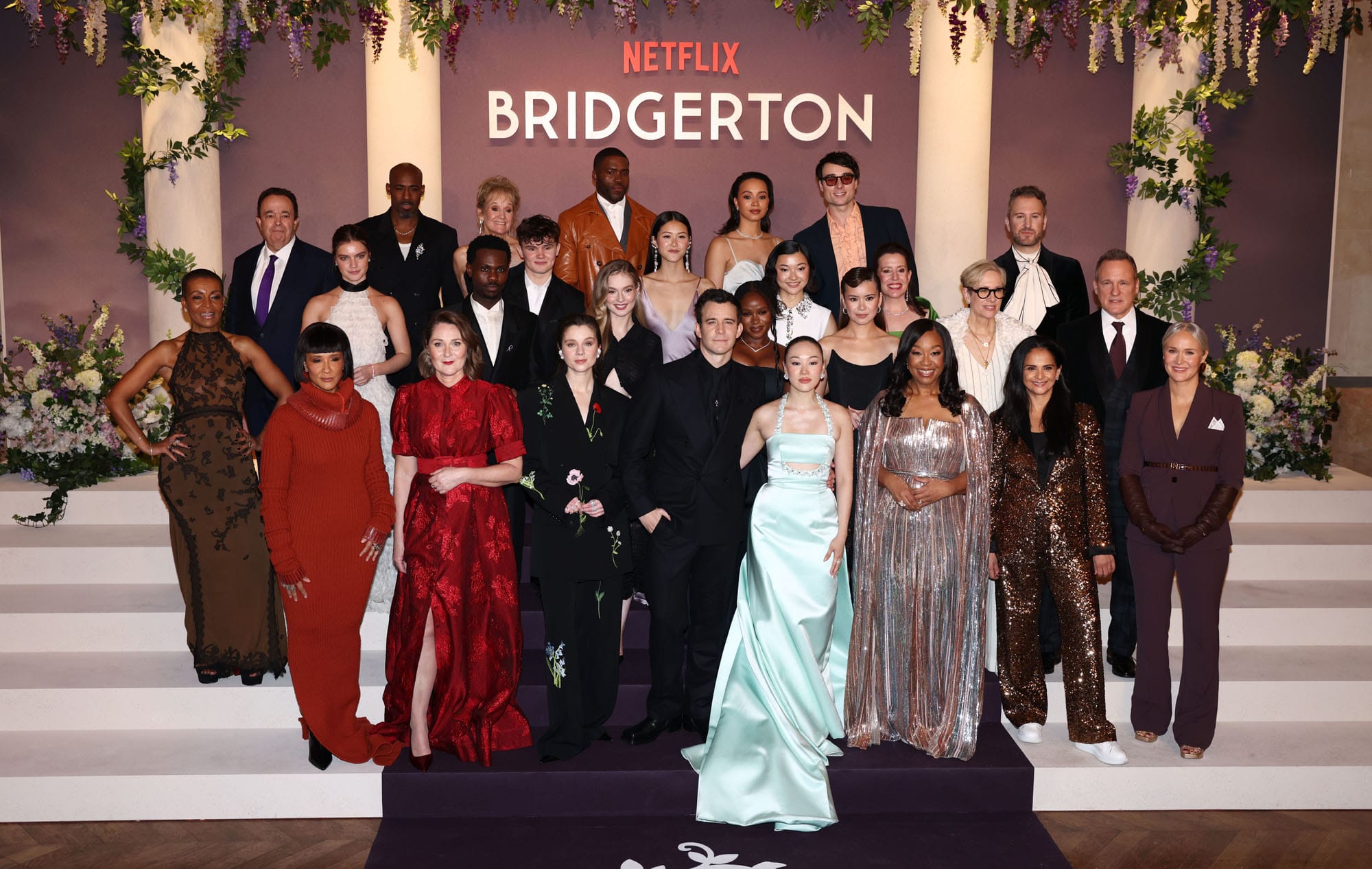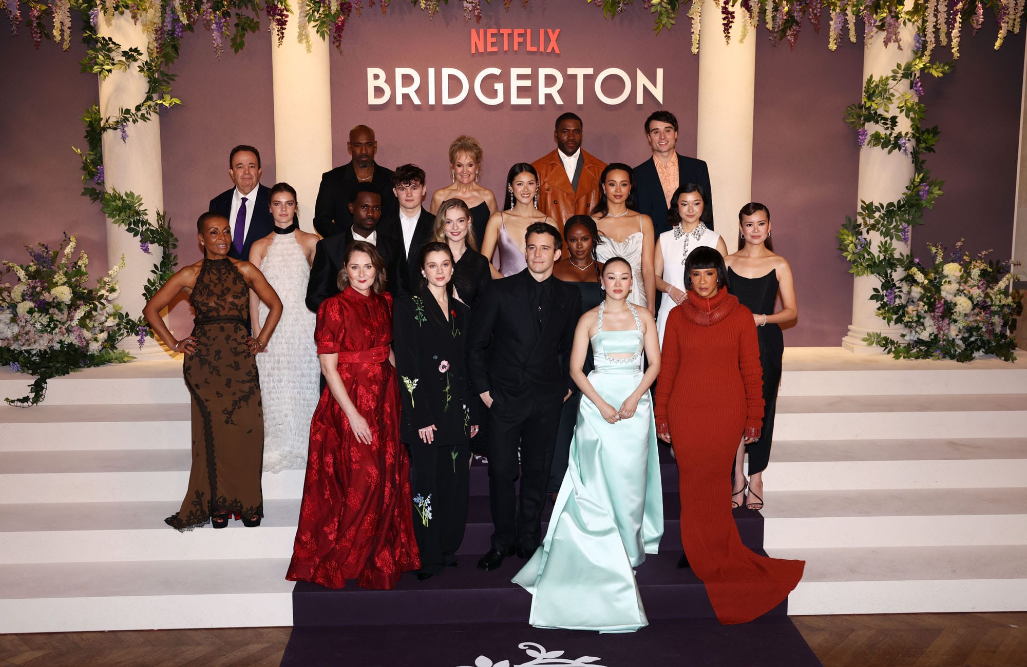 Yerin Ha and Luke Thompson attend the "Bridgerton" Season 4 Paris World Premiere at Palais Brongniart on January 14, 2026 in Paris, France and Adjoa Andoh, Golda Rosheuvel, Hugh Sachs, Florence Hunt, Ruth Gemmell, Daniel Francis, Victor Alli, Lorraine Ashbourne, Will Tilston, Claudia Jessie, Hannah Dodd, Martins Imhangbe, Isabella Wei, Luke Thompson, Masali Baduza, Emma Naomi, Yerin Ha, Michelle Mao, Oli Higginson, Katie Leung, Julia Quinn, Shonda Rhimes, Betsy Beers, Chris Van Dusen, Bela Bajaria, CCO, Netflix, Tom Verica and Jess Brownell attend the "Bridgerton" Season 4 Paris World Premiere at Palais Brongniart on January 14, 2026 in Paris, France
