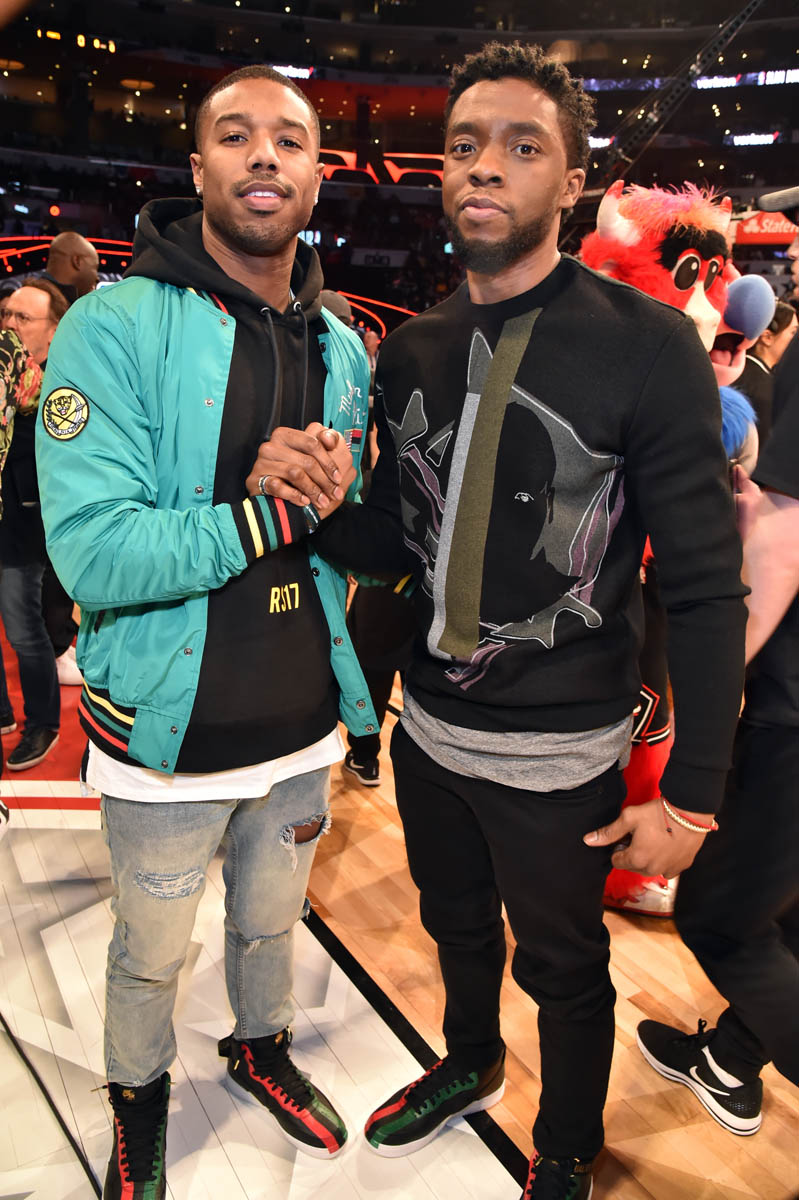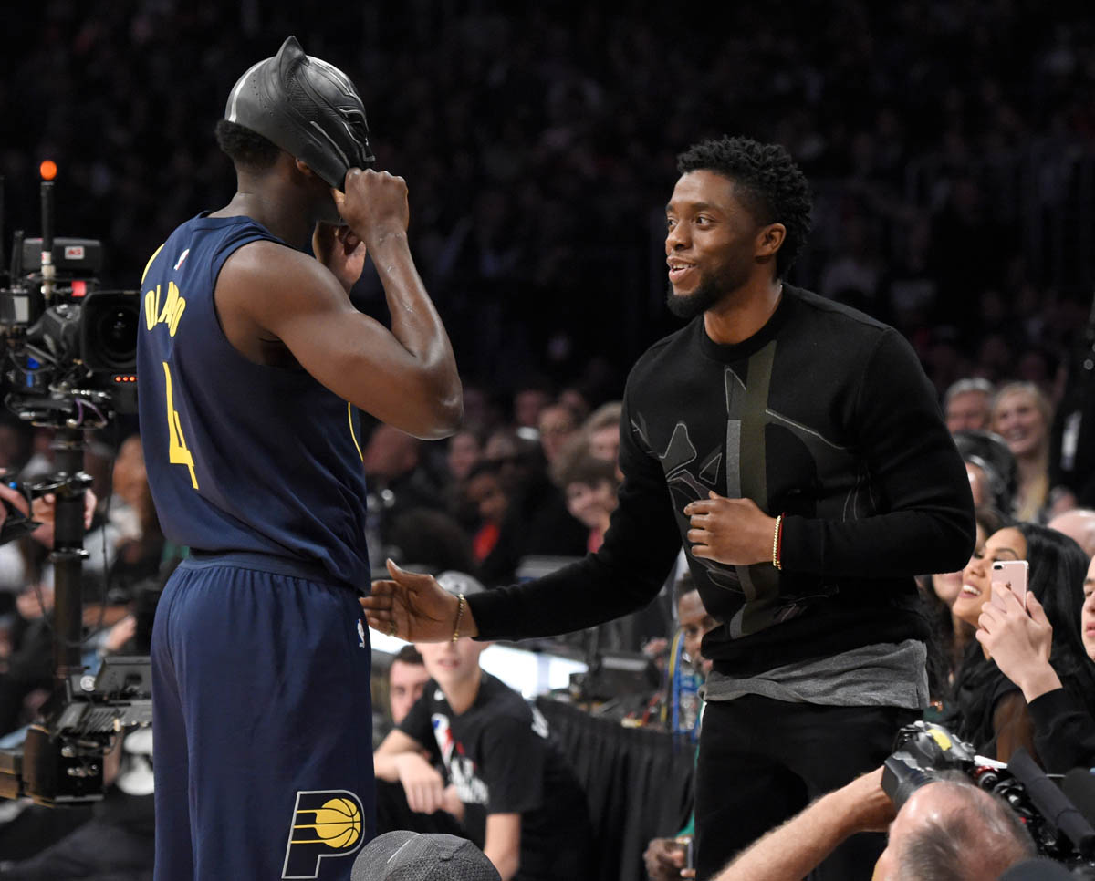 So… how did Chadwick Boseman celebrate Black Panther’s historic weekend? Fittingly in Los Angeles, for NBA All-Star weekend. He was courtside for All-Star Saturday night, handing off the Black Panther mask to Victor Oladipo, whose parents are from Nigeria and Sierra Leone, during the dunk-off: