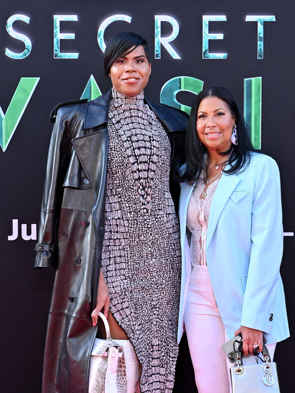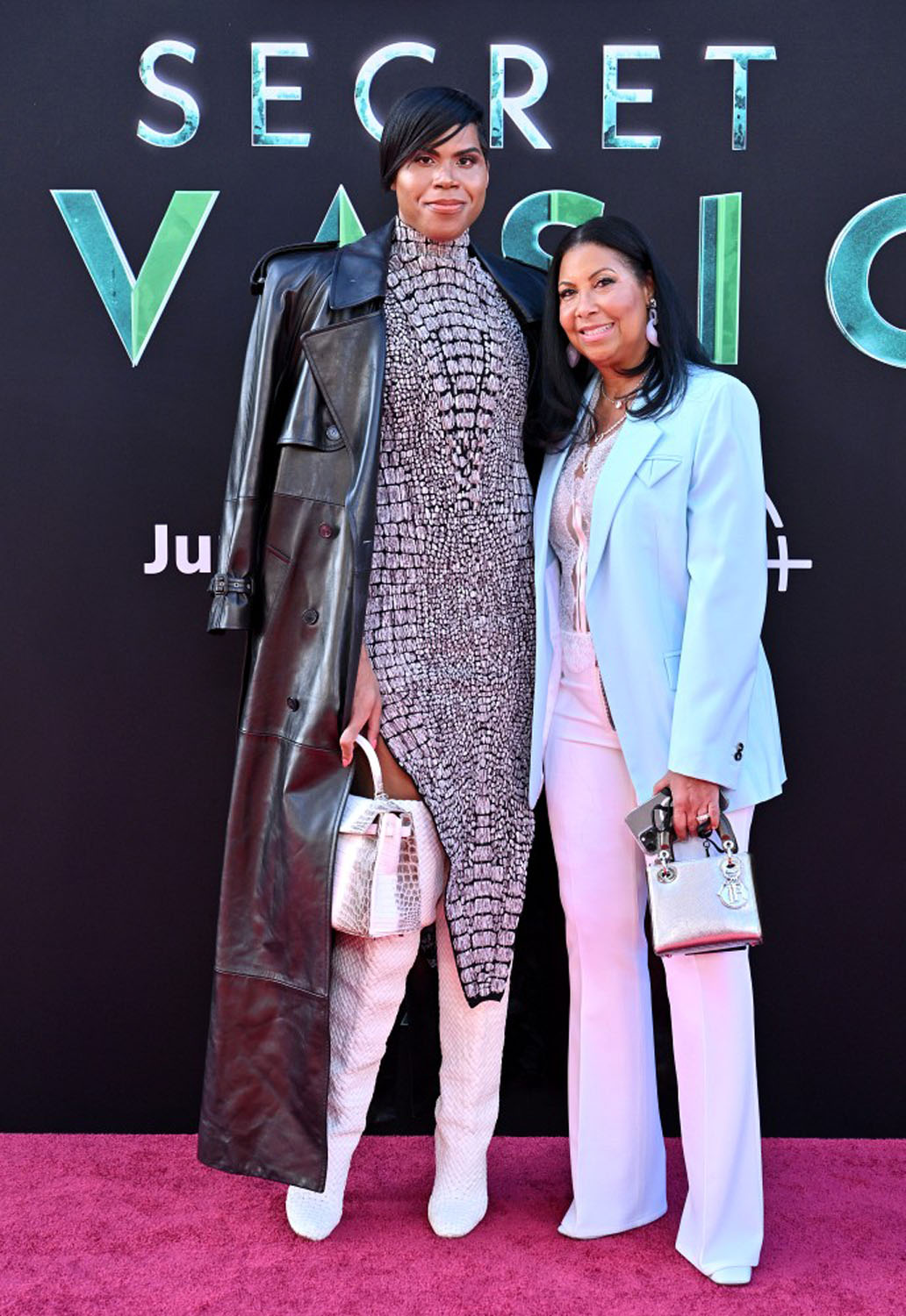 You know who is the style standout on the red carpet, though? EJ Johnson. He was there with his mother, Cookie (Magic was not, however, present). Cookie looks like she’s dressed for a power lunch at The Polo Lounge, but EJ came ready to play. He’s known for androgynous and feminine looks on the red carpet, but his crocodile print dress, thigh high boots, and leather trench is perfect for this particular premiere. The dress evokes the reptilian look of the Skrulls without being too literal—unlike Angelica Torres, who painted half her face green—and the leather trench is like someone said, Nicky Fury, but make it fashion. He looks amazing, and clearly put more thought into his outfit than anyone else at the premiere.