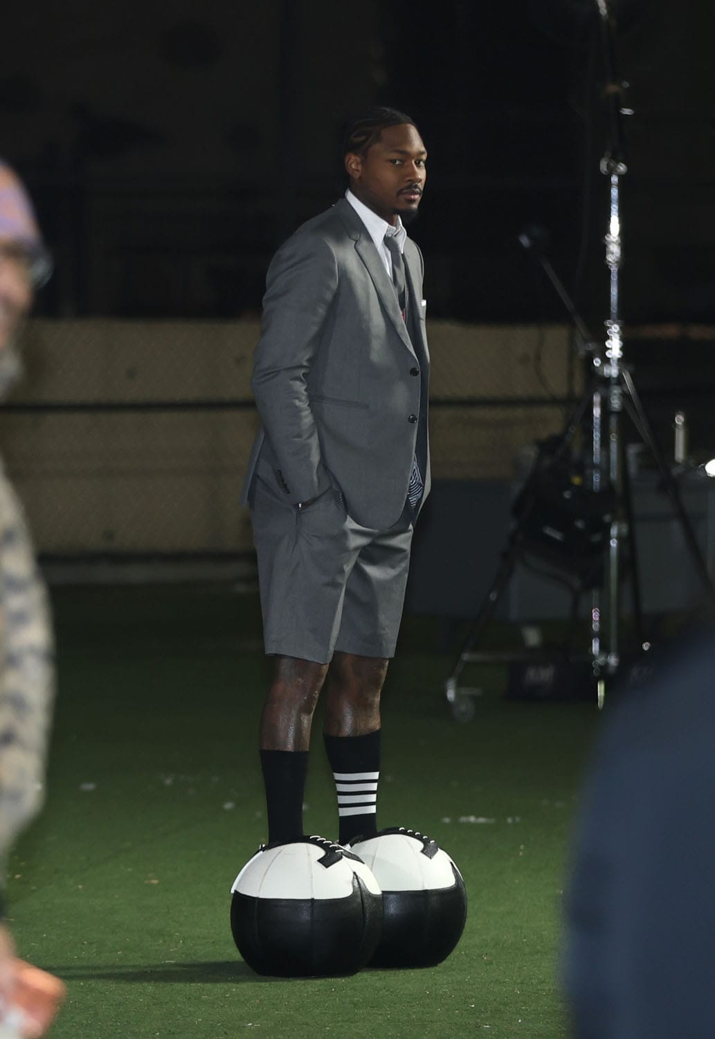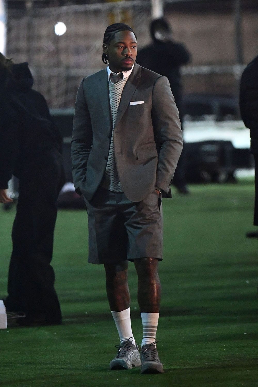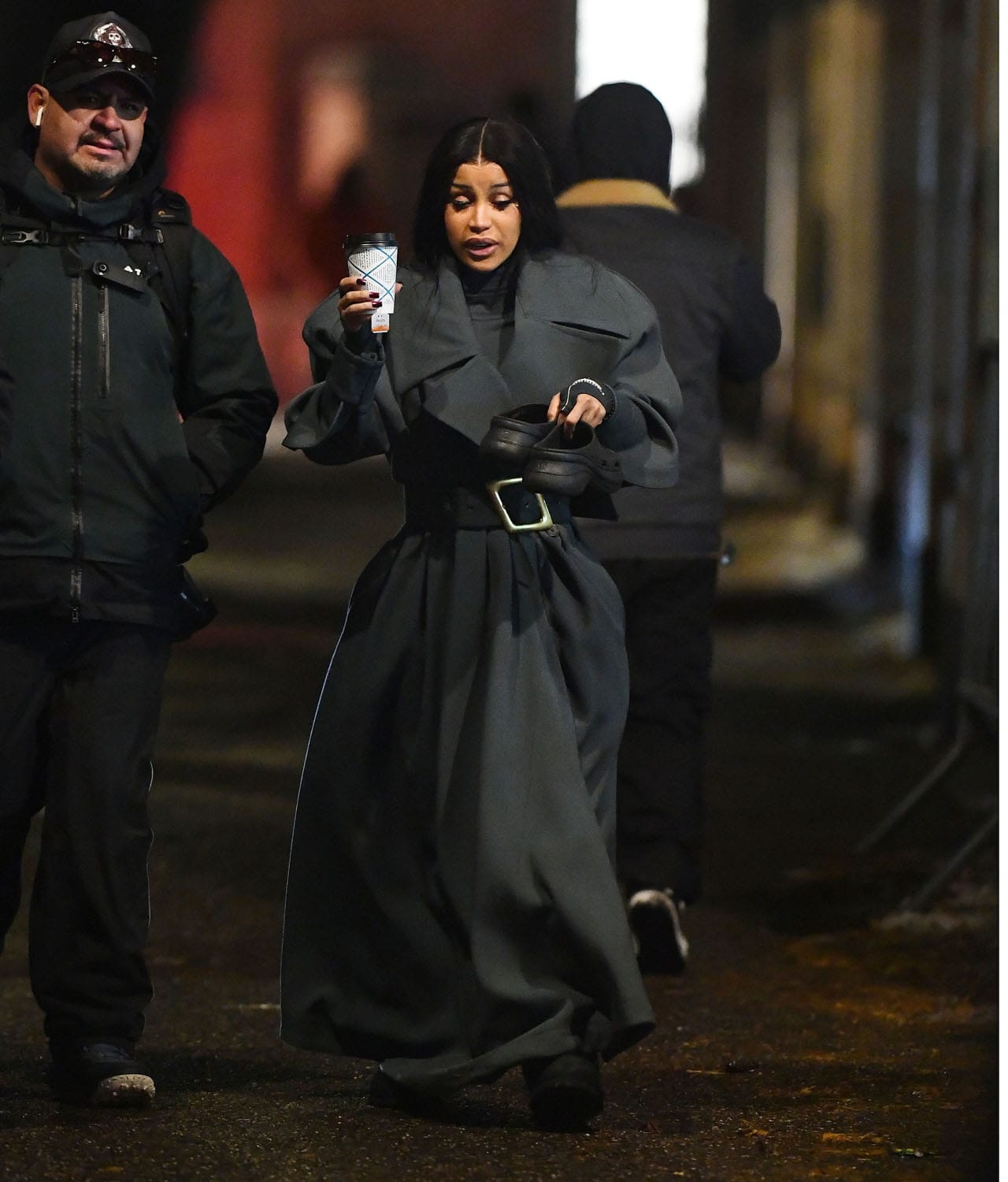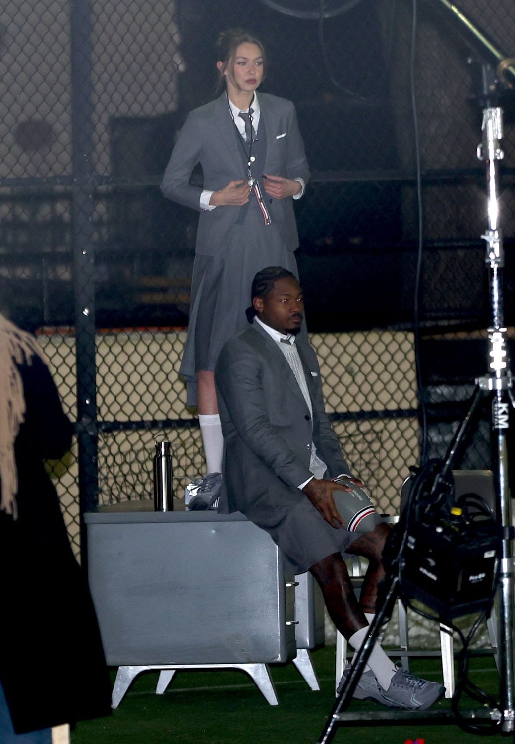 Last night Cardi and Stefon were in New York City for a photo shoot with GQ that looked like it was Thom Browne themed. Gigi Hadid was there too and they were all dressed in TB grey, although at one point Cardi was wrapped in a sleeping bag to keep warm. I am obsessed with all of these outfits, from his mesh sweater to Gigi’s long kilt and especially the cut of Cardi’s coat.