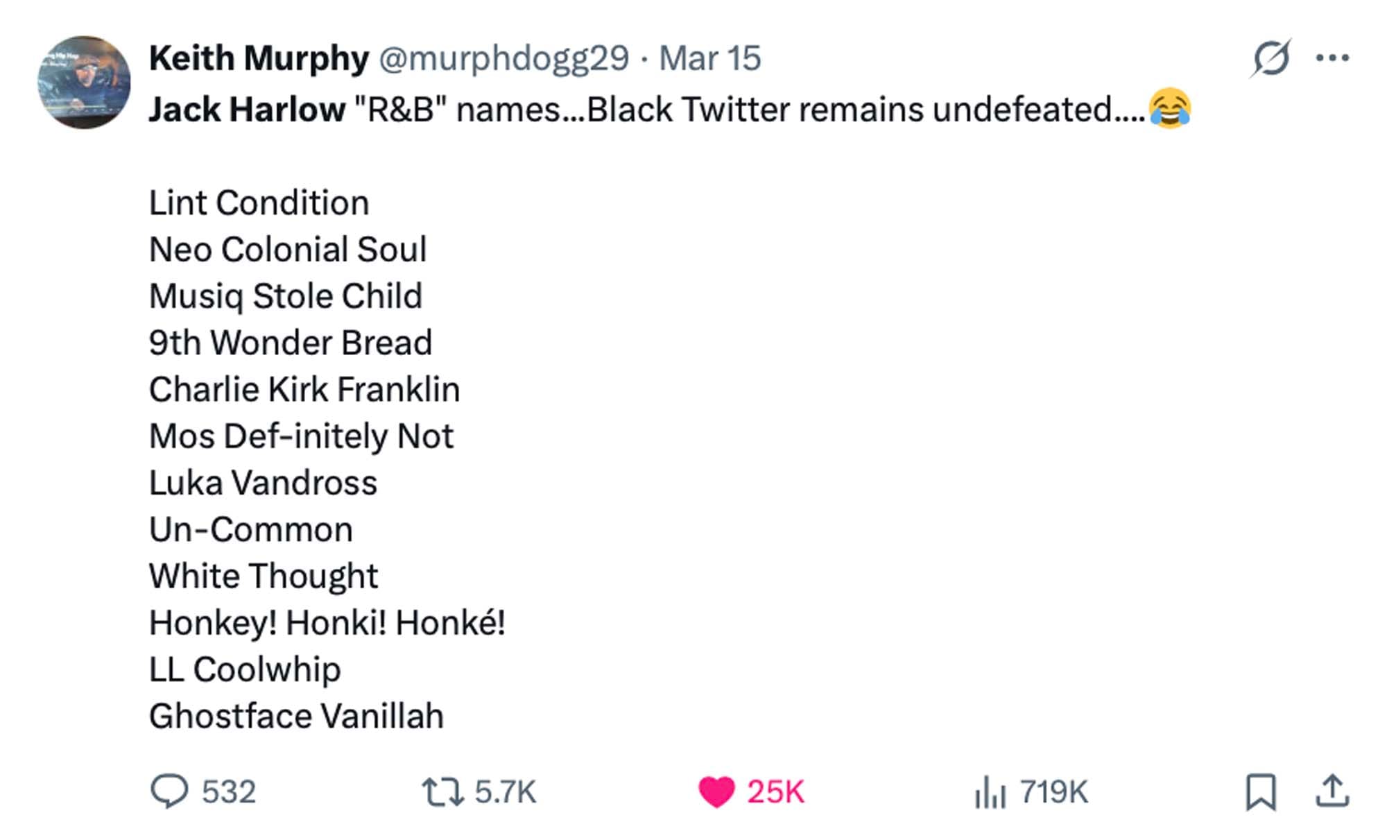Is it upsetting? Yes. Tiring, even? Absolutely. But is it going to change? Honestly, probably not. Because we cannot do the job of holding artists to account when there are larger systems in place that not only allow, but encourage and allow it to be profitable, while our only form of repayment is the shuffling off of conversations about race and naming the album after an n-word joke. At this point, it’s clear Jack Harlow is making ‘Black’ music for white people who don’t know what true Black music is.