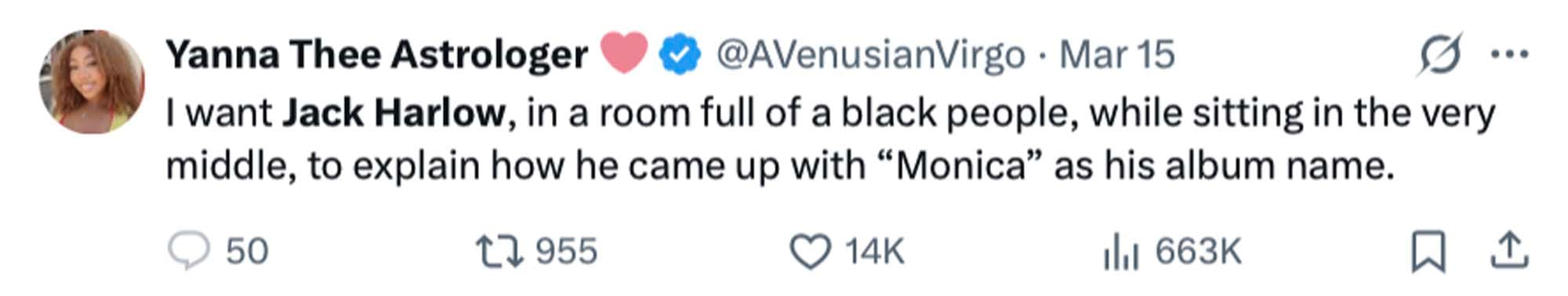 W Kamau Bell gave the joke his seal of approval despite it being perhaps one of the most dangerous jokes a white man might ever tell. But rather than credit Zach, Jack attributed the album name to simply liking the name Monica. Between the audacity to suggest he was becoming ‘Blacker’ through his music, his refusal to acknowledge his privilege and his refusal to credit Zach for inspiring his album name, I was done done with Jack Harlow.