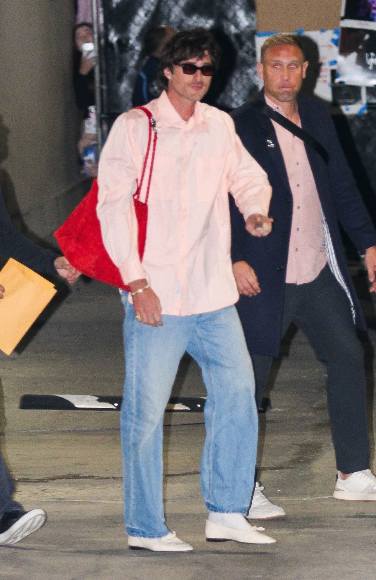 Jacob Elordi arrives at Jimmy Kimmel Live! with his dog Layla, January 27, 2026