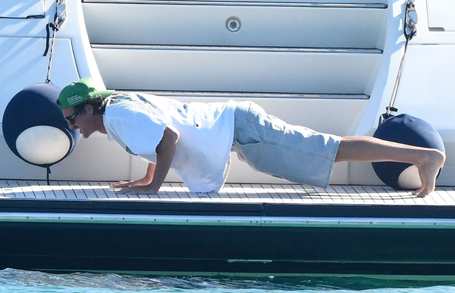 In that spirit, I laughed when I looked at some of the photos of him on his holiday and zoomed in on his poolside reading material: Jean Cocteau, The Art of Cinema. Can’t wait for him to quote Jean Cocteau in his future interviews. Apologies I can’t include any of those shots in this post because they cost extra but you can see them here. I’ll make up for this with the shirtless shots. And at one point he dropped down for some push-ups on the deck and Olivia’s dad was doing it too. Let’s talk about Jacob Elordi, thespian, some more over at The Squawk today. (App link here)