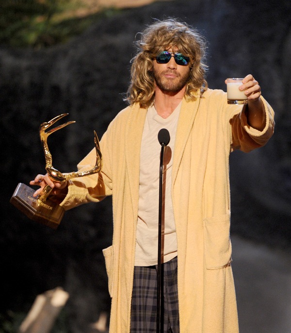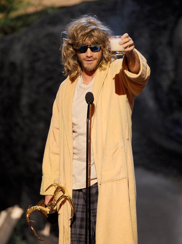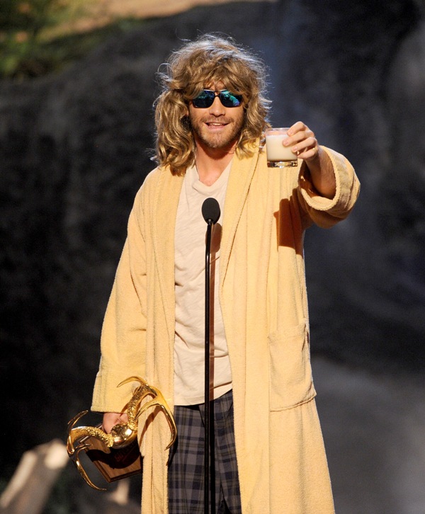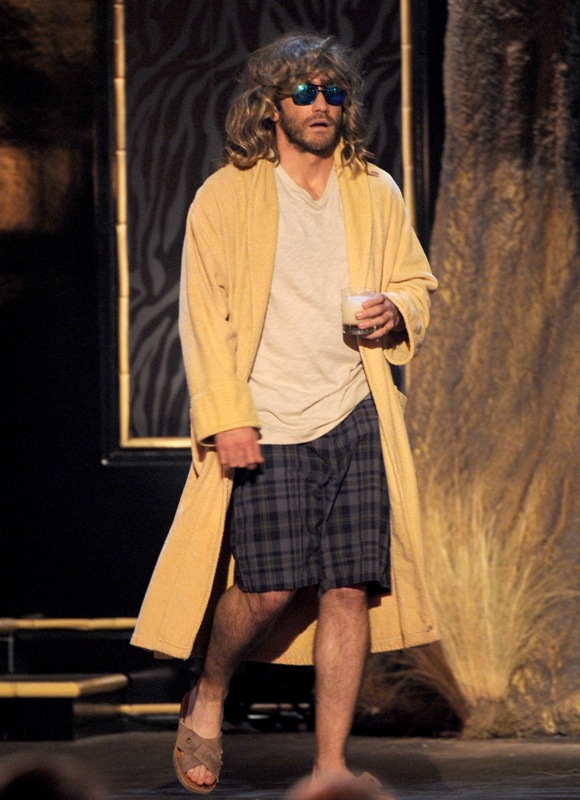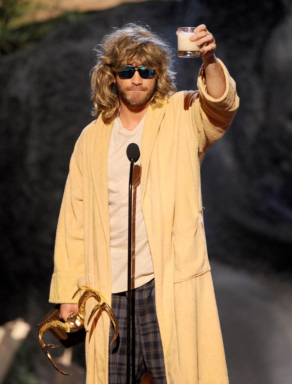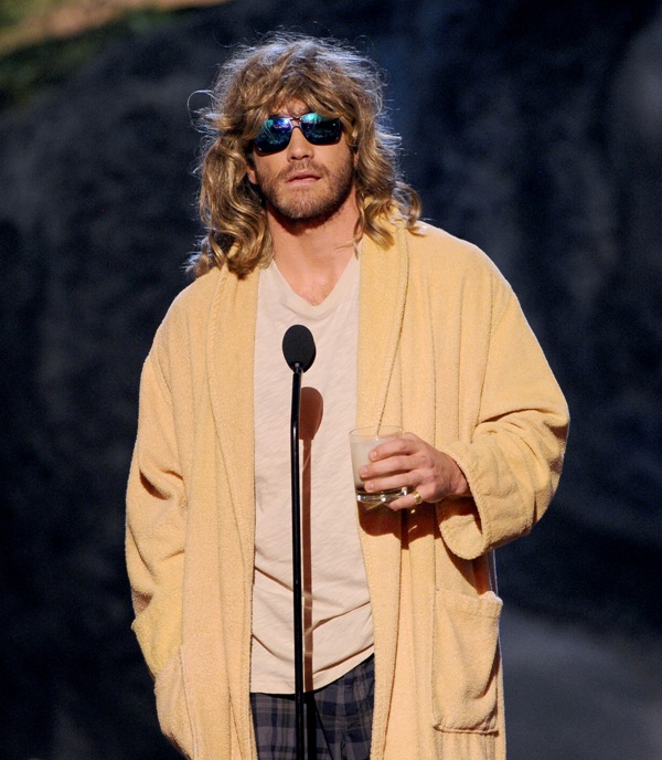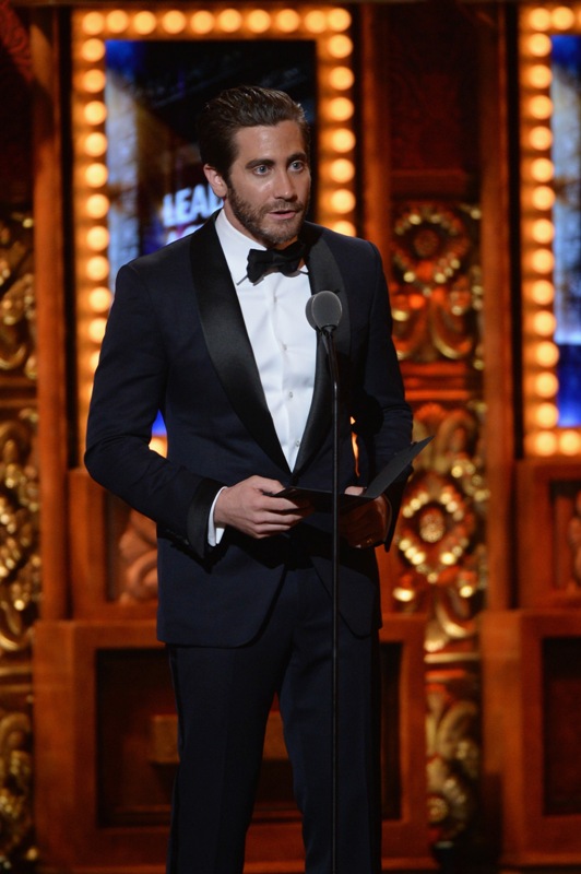 Jake Gyllenhaal hit up two award shows this weekend. On Saturday night he was in LA for Guys Choice, presenting to Jeff Bridges dressed up as The Dude. I preferred him this way. On Sunday he was at the Tonys looking very handsome in a tuxedo though I could do without the pinky ring.