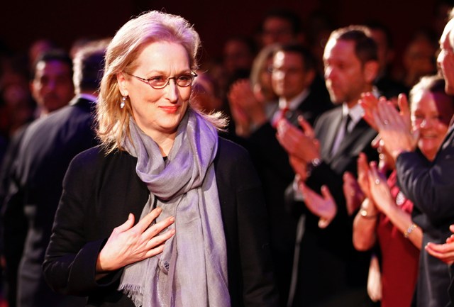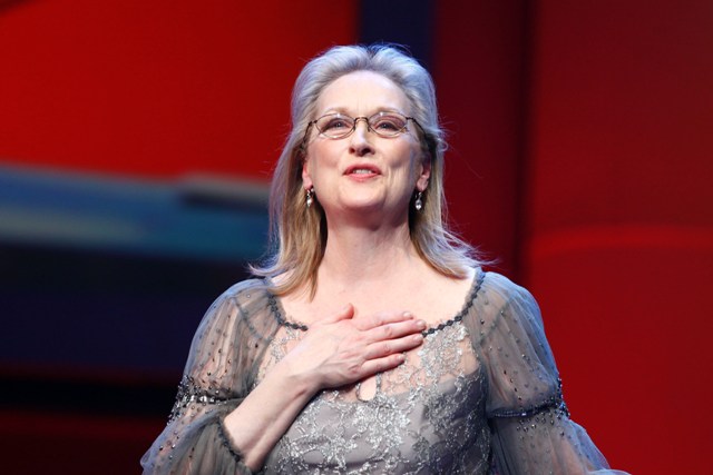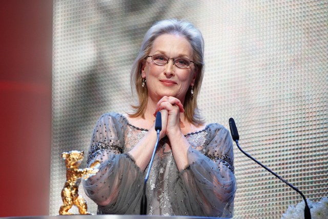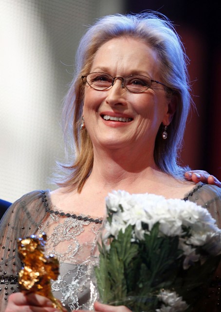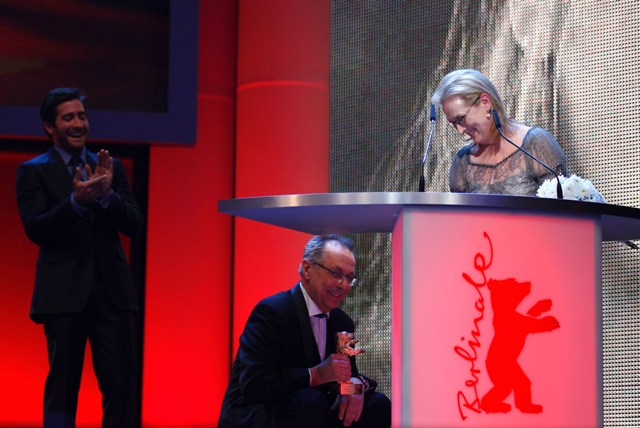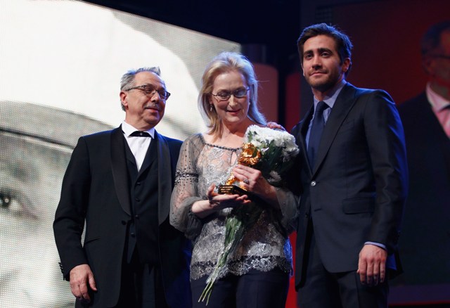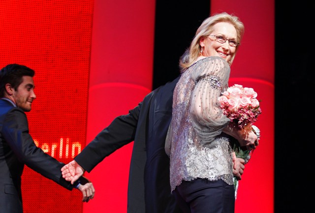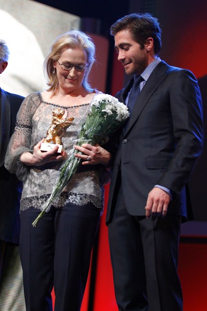 Meryl Streep was honoured with the Golden Bear Award at the Berlinale last night with Jake Gyllenhaal presenting. Jake grew up hanging out with Meryl's son and he told a story about the two of them, being young and bratty, getting into trouble, and how he was afraid of Mrs Streep back then. And now.