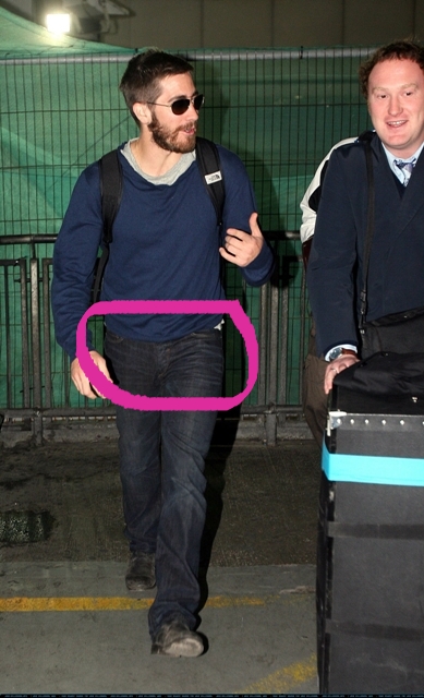 Take a look at Jakey arriving in London the other day to promote Rendition – a movie so disappointing critics actually WALKED OUT during the screening at TIFF – persisting with that beard and completely clueless about how to properly wear a pair of pants. I’ve taken the liberty of highlighting the problem area: the waist is too high, the hips are too tight…