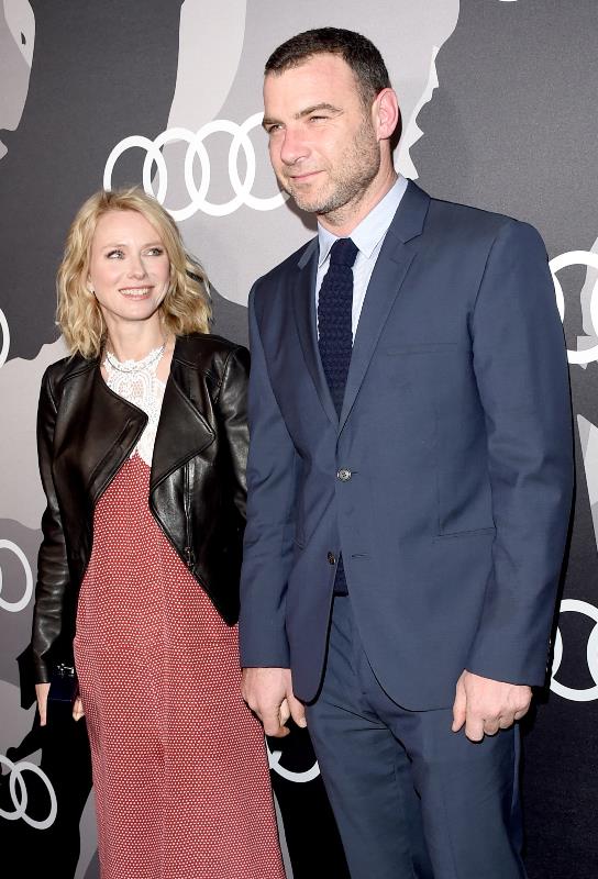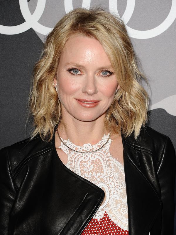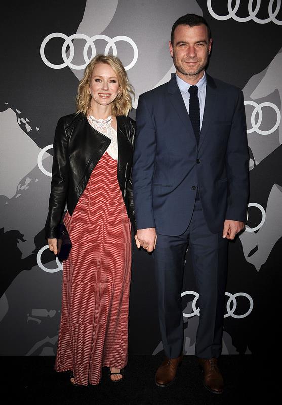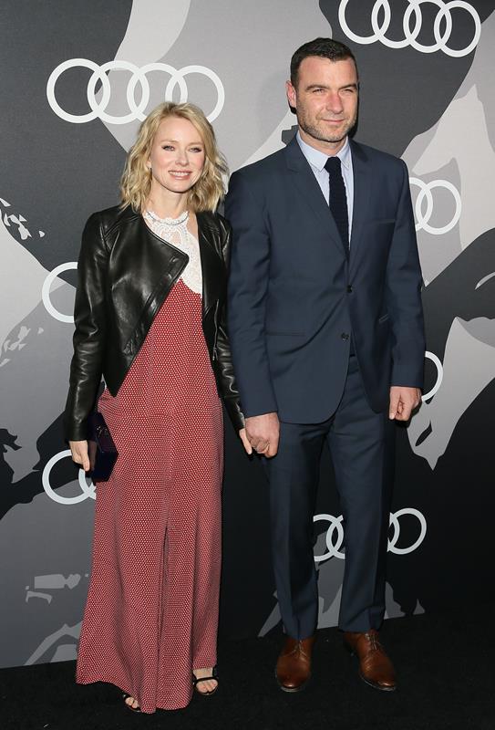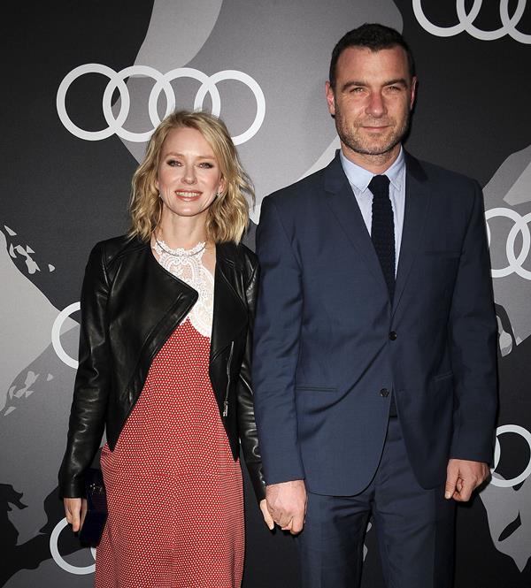 Finally, Naomi Watts at the Audi pre-Globes party with Liev Schreiber. He’ll be representing Ray Donovan and nominated for Best Actor in a TV Drama. She’s part of the Birdman team. I love the look of this leather jacket over that dress. And it’s already a great dress.