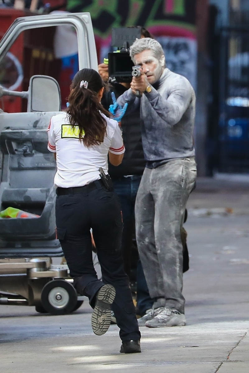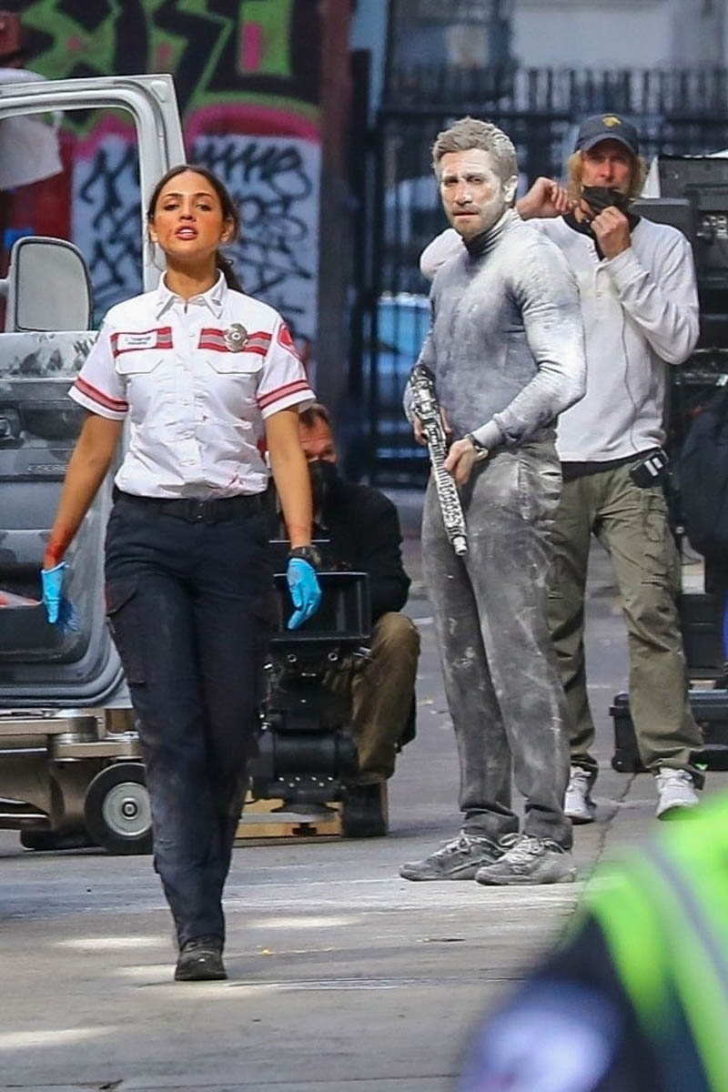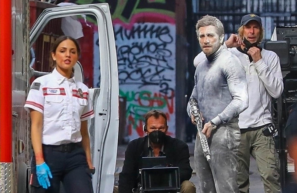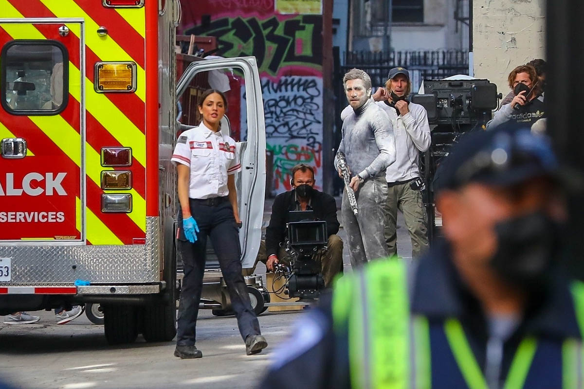 Here are Jake Gyllenhaal and Eiza Gonzalez on the LA set of Ambulance, directed by Michael Bay. Because this is a Michael Bay movie, I am surprised that Eiza, who may be playing a paramedic, is not dressed in a bikini. But maybe Michael Bay is doing better by women now in his work.