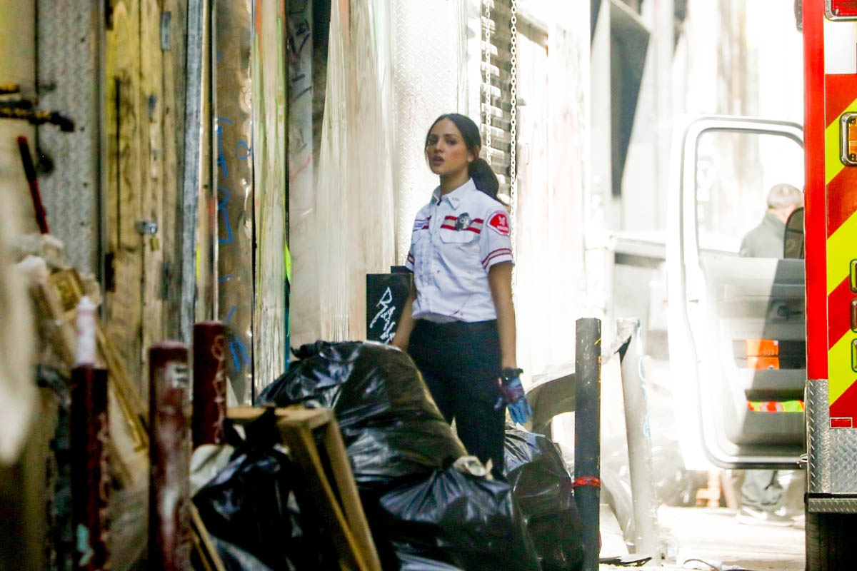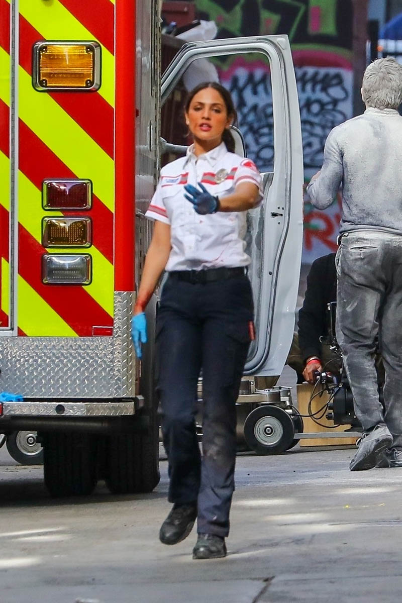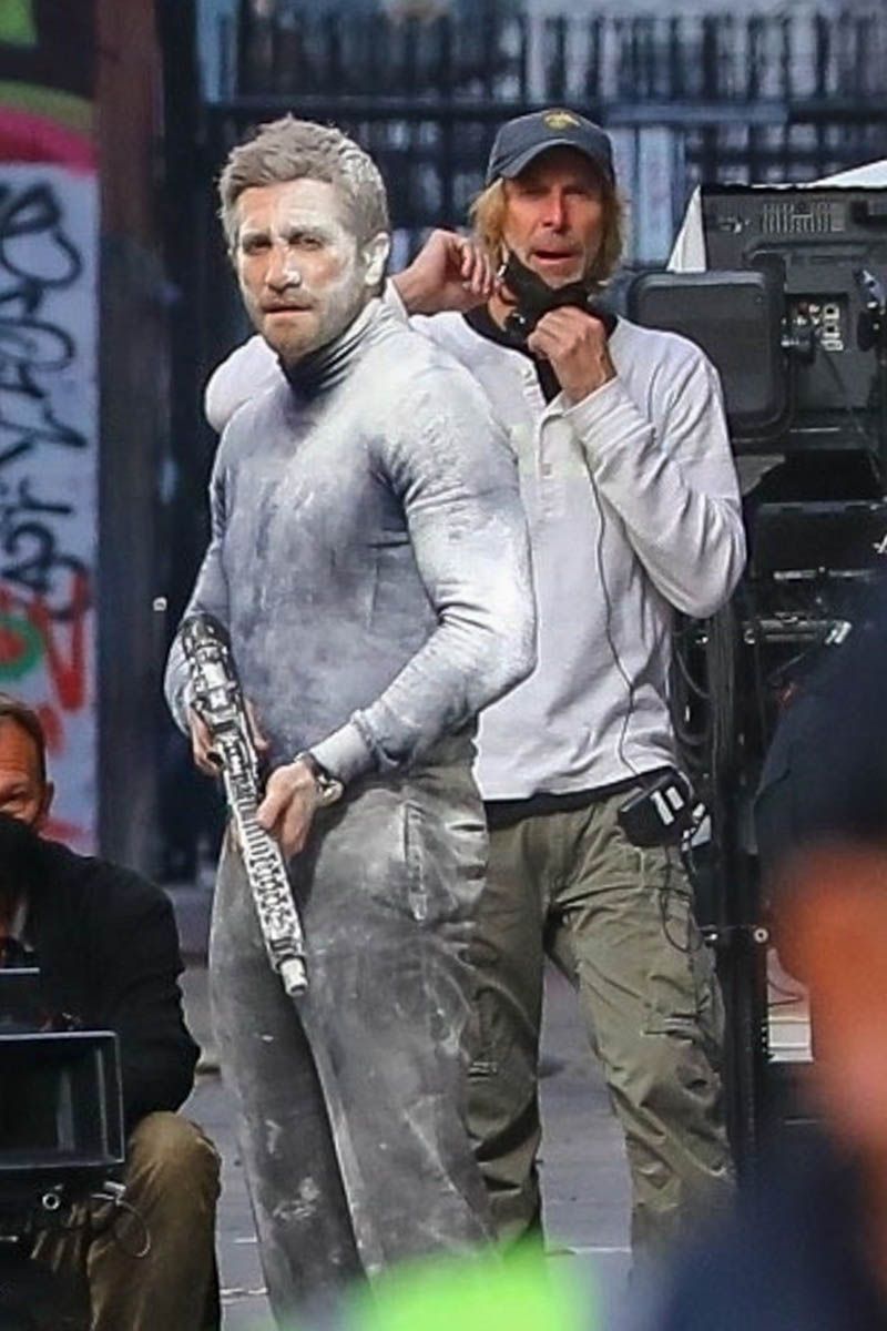 Here are Jake Gyllenhaal and Eiza Gonzalez on the LA set of Ambulance, directed by Michael Bay. Because this is a Michael Bay movie, I am surprised that Eiza, who may be playing a paramedic, is not dressed in a bikini. But maybe Michael Bay is doing better by women now in his work.