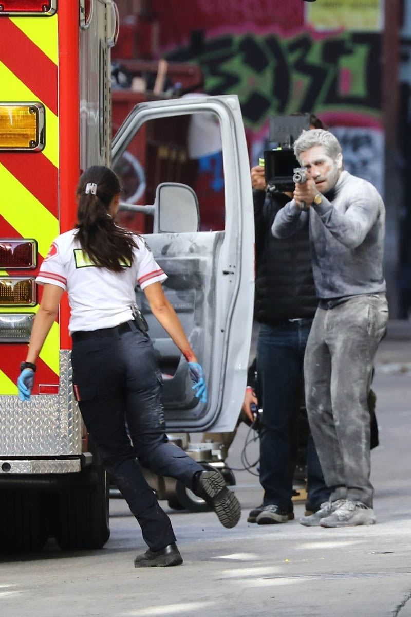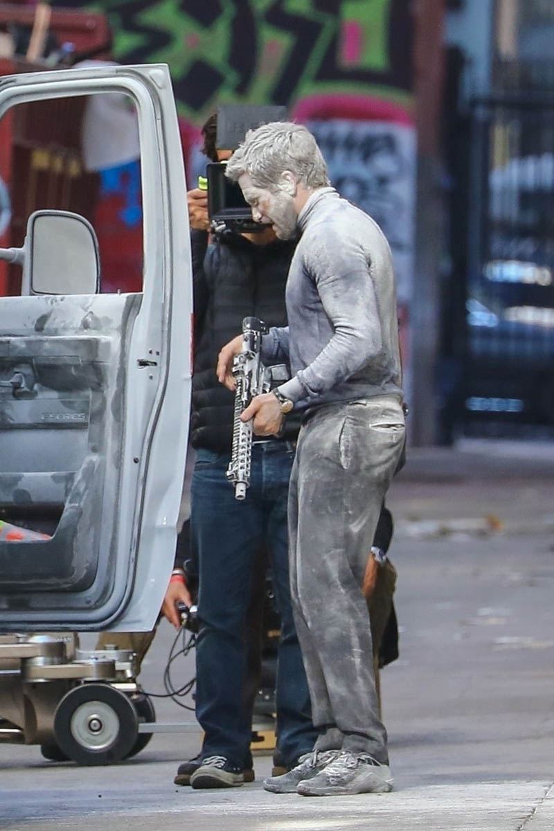 The reason I’m posting these shots though is because Jake appears to have some kind of explosive dust all over him (things go fast and boom!, see?) and as a result, it looks a little like he’s gone grey. Actually, when I first looked at these photos in thumbnail, I thought maybe he’d gone platinum blondish. It’s amazing though how the makeup and hair artists have been able to apply the dust on his hair so evenly. From where I am, if it weren’t for all of it on his face, it could have been a dye-job, non? (It is a not a dye-job, I don’t think, because in pictures from another day on set, his hair is his usual brown.) It looks good on him, non?