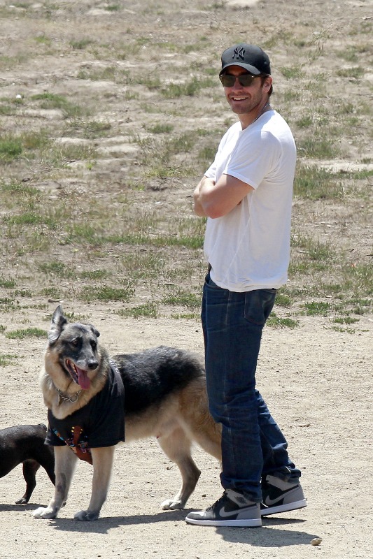 Earlier this week, Jake, in the same clothes, was photographed out with his German shepherd, Atticus who, for some reason, is wearing clothing, and is very well behaved off-leash. How old is Atticus now? He was puppy when Jake and Kirsten Dunst were together. They broke up in 2004. So at least 10? In dog years, they say that’s around 75. My beagle Marcus is 10 too, about 56. But the bigger the dog, the faster they age. Atticus is a senior citizen. You worry about your senior citizen dogs. I worry about celebrity dogs. Like, when Jakey’s in New York and travelling around the world, and Atticus can’t go with him, who’s he hanging out with? That’s the part of being a movie star that must suck. You miss so much time with your pets.