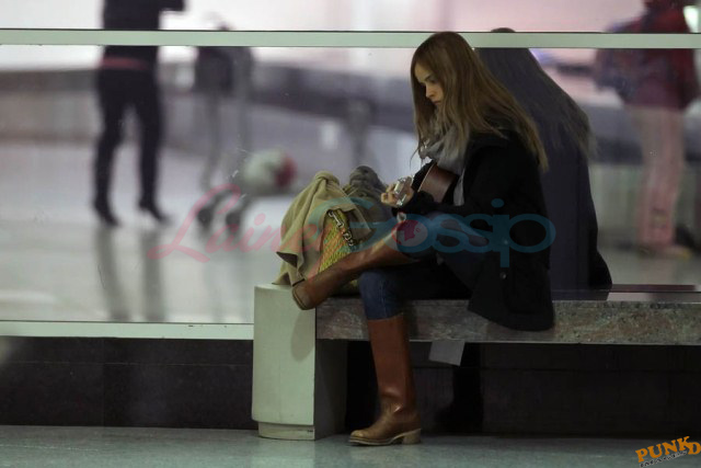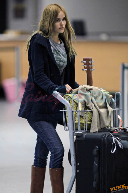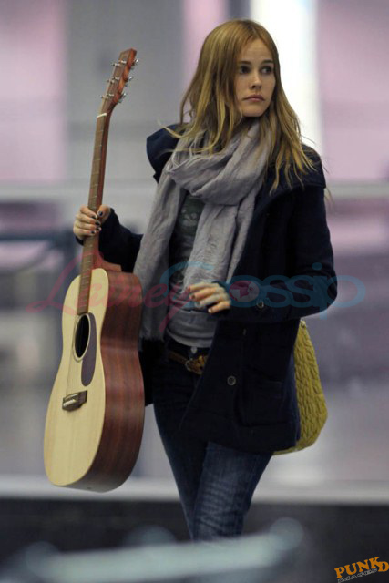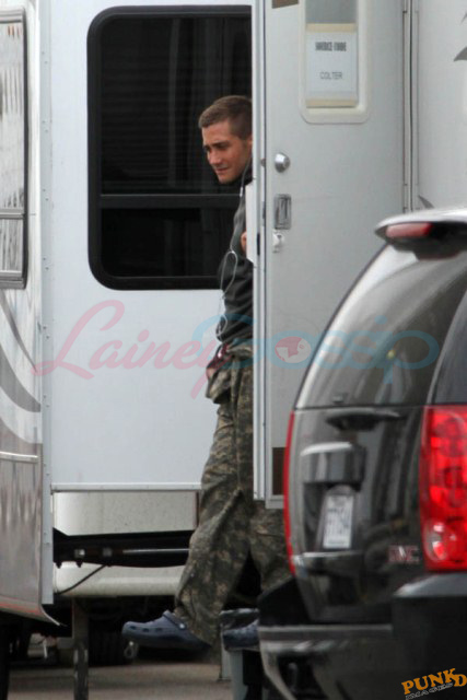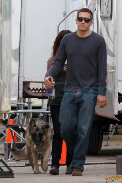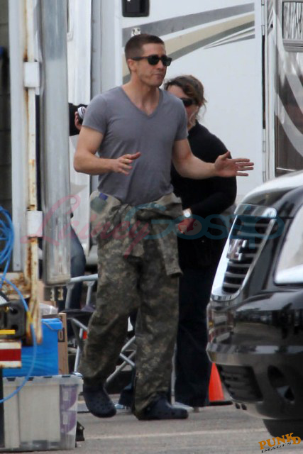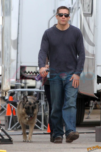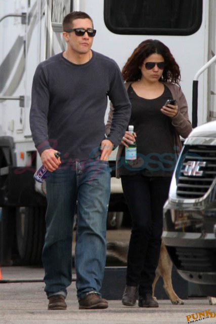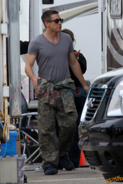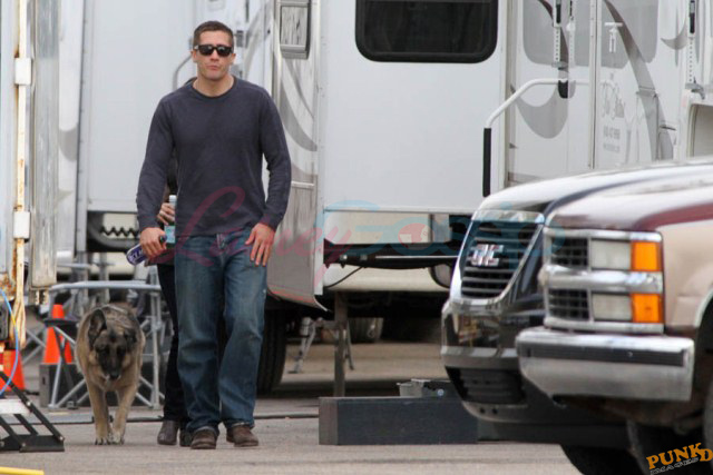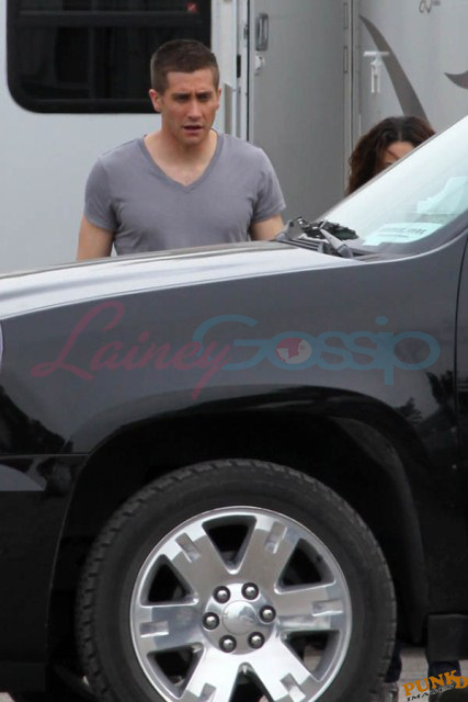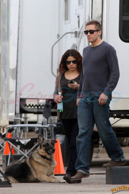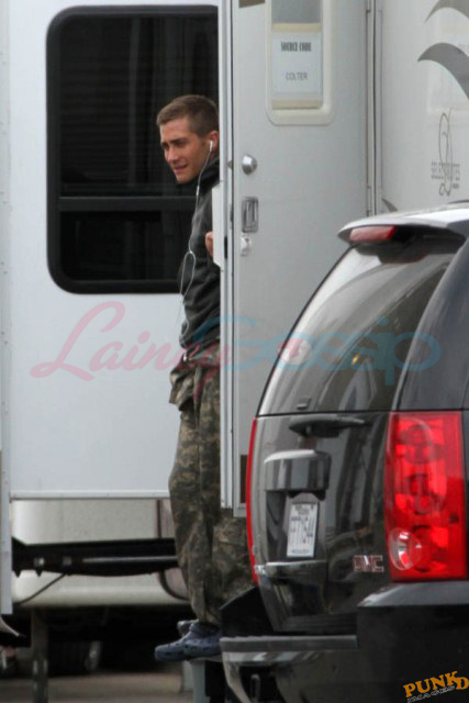 Anyway, these are photos of Jakey on the set of Source Code in Montreal this week. Jakey’s been shooting there for a couple of months. Also attached – pictures of Isabel Lucas, his location fling, arriving back in Montreal from Los Angeles with her guitar. What a face. Slight overbite and bow-shaped lips. Gorgeous.