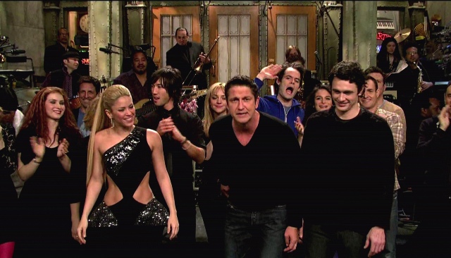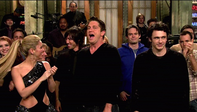 James stood next to Spittle Gerry Butler during the finale, looking tired at the end of a long night. He had come straight to SNL from the New Yorker Festival where he discussed his work, he discussed his writing, he discussed his prosthetic penis from Milk, and he revealed that he owns the rights to The Broken Tower.
