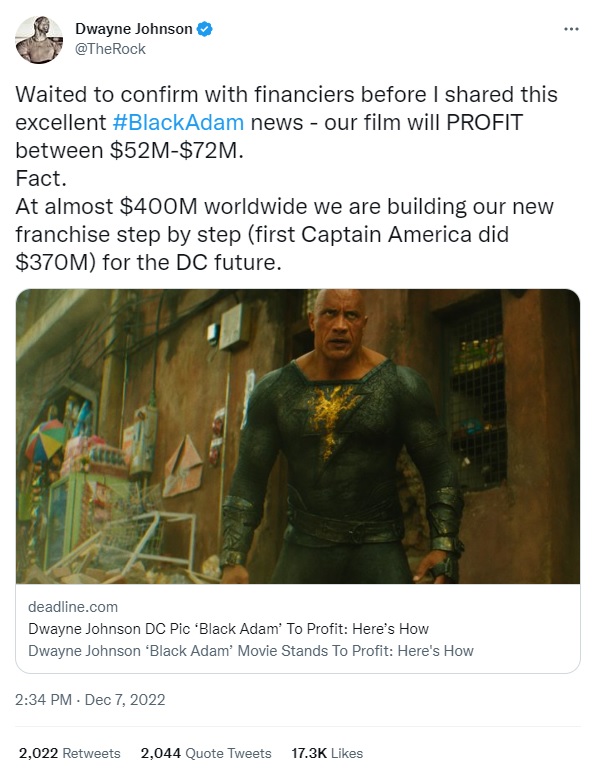 Speaking of Black Adam, it kind of seems like Dwayne “The Rock” Johnson and Warners are now in a slap-fight about how well the movie is or is not doing. Following reports that Black Adam could lose $50-100 million, Johnson has Deadline writing profit scenarios in which they actually make $52-72 million. Hollywood math renders all numbers meaningless, but Warners spent upward of $300 million to launch Black Adam (including marketing), there’s no way even $72 million is a positive result. And comparing Black Adam and the first Captain America movie is disingenuous because 1) that movie came out in 2011, before superheroes cemented their grip on pop culture, 2) Chris Evans wasn’t one of the actual biggest stars in the world, and 3) it cost less to make and market.