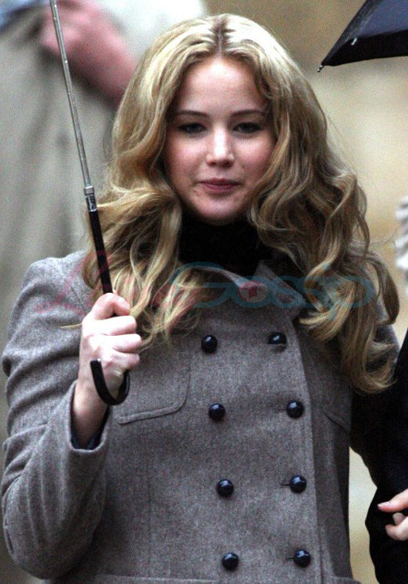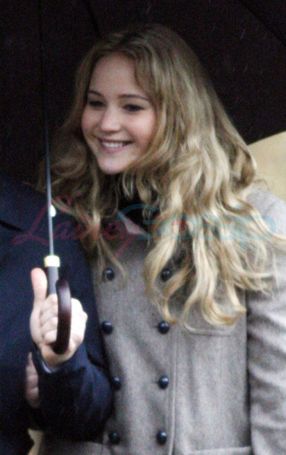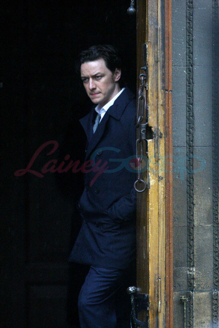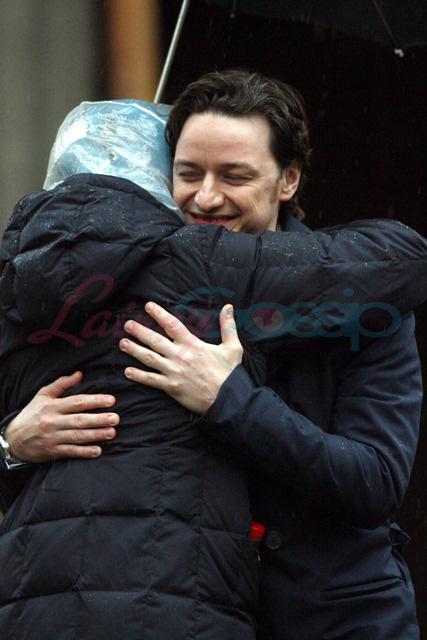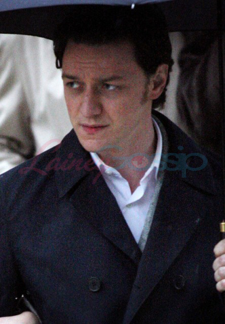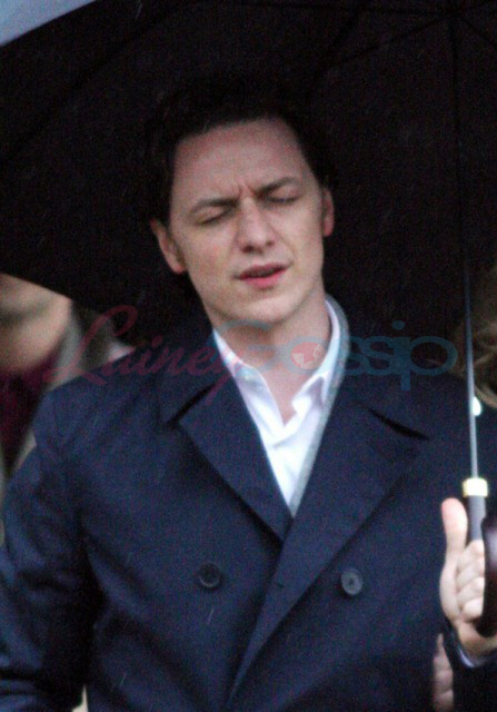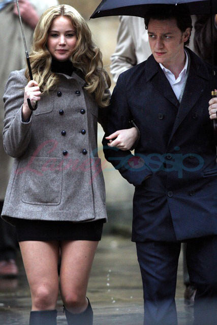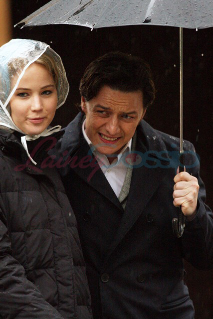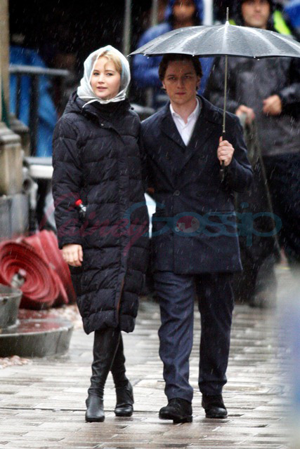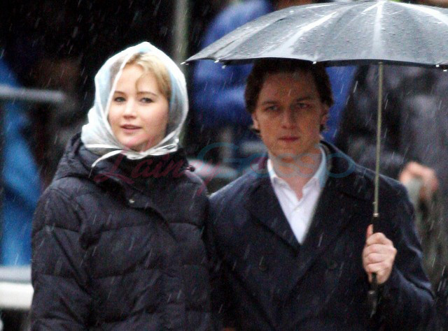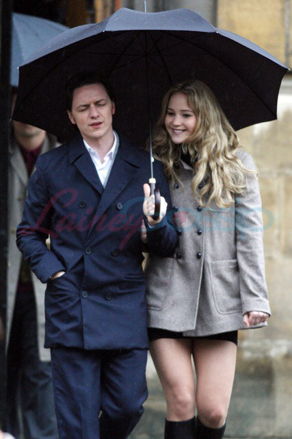 In Oxford today on the set of X-Men: First Class – it’s James McAvoy (Charles Xavier) and Jennifer Lawrence (Mystique) shooting in the rain. Gorgeous retro, non?