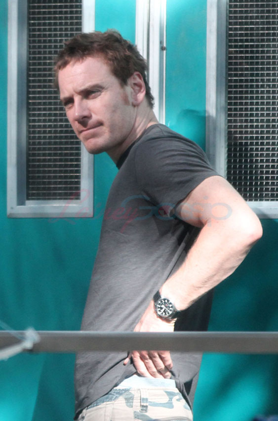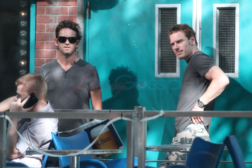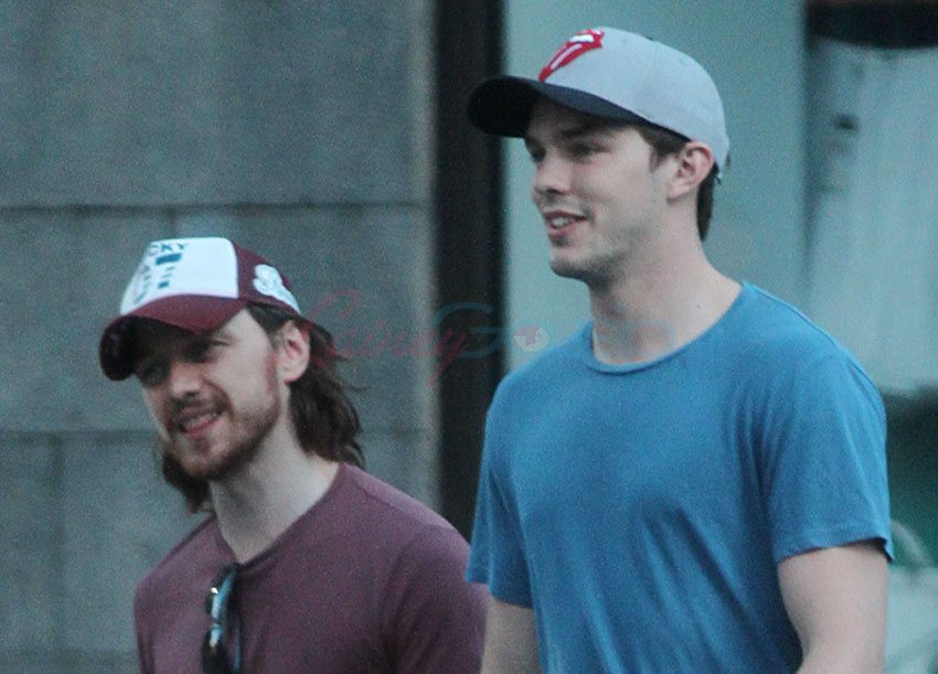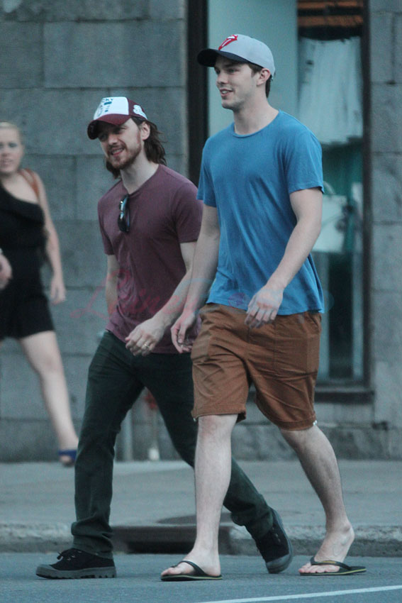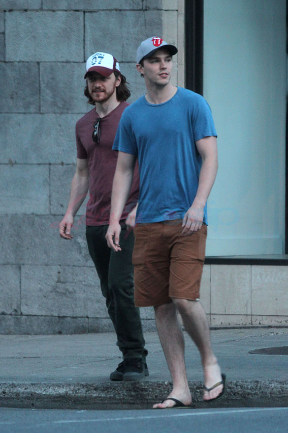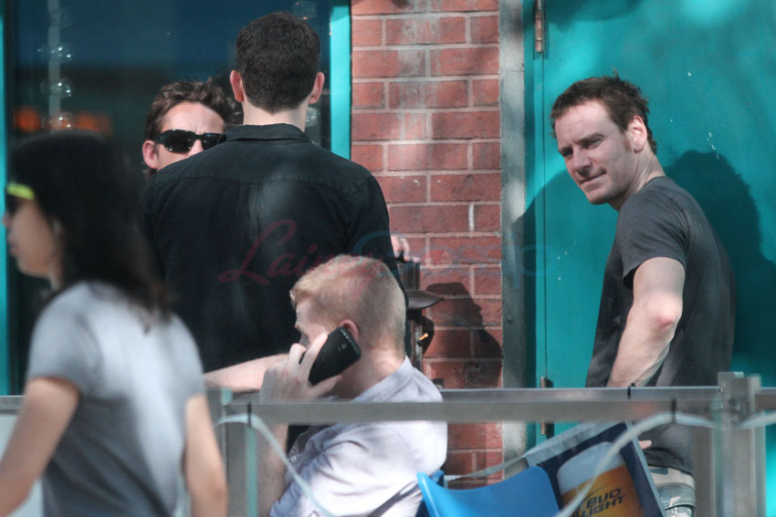 X-Men: Days Of Future Past is in production in Montreal. As it was Canada Day yesterday, cast members had the day off. Here are James McAvoy, Michael Fassbender, and Nicholas Hoult hanging out in the afternoon. They hit up a local pub to watch the football game, play some pool, and smoke some hand-rolled cigarettes. McAvoy and Hoult took off afterwards on their own. I’d like to think that if Jennifer Lawrence were around, and not in Paris for Dior, she’d be chalking up her cue stick and sharking all of them.