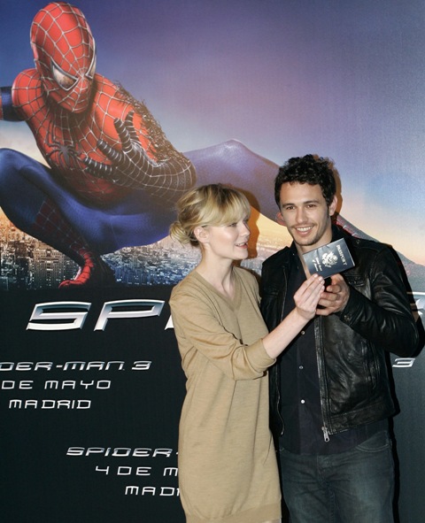 Kiki in Rome for the Spidey 3 premiere last night in a print dress with the most gorgeous hem and an even better pair of black satin shoes (there’s a bow on the toe) and neutral today in Madrid at the photocall, wearing textured tights and … sigh… an even more killer pair.