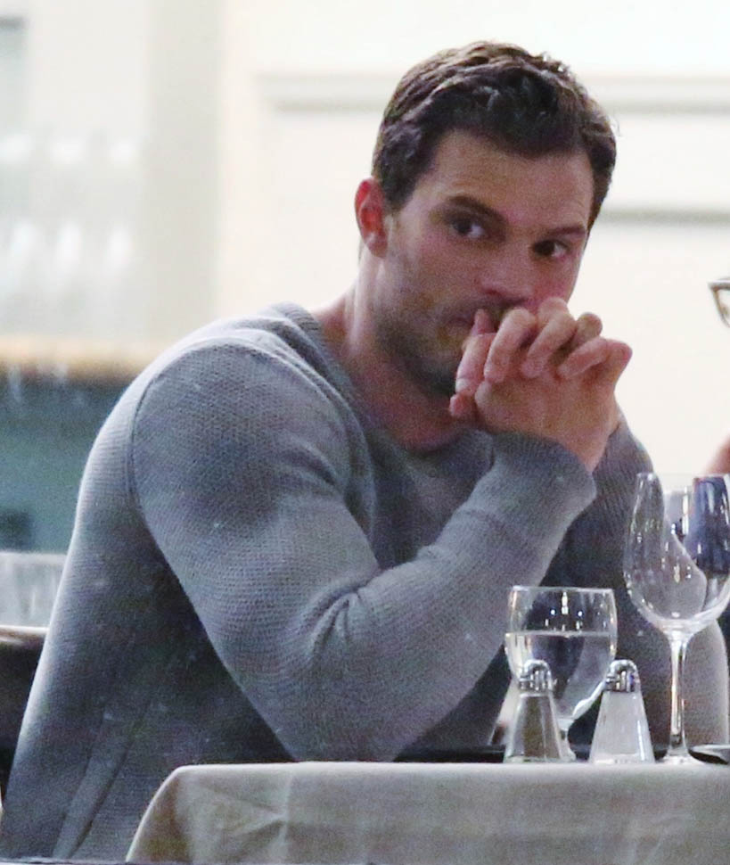 It’s Jamie Dornan as Christian Grey wearing a grey. Like wearing the sh-t out of this grey sweater. And spectacularly lit. He’s gorgeous. If Jamie’s Christian Grey could just be like this, not talking, not acting, I’d be watching that movie every night, in horny pain. The problem is that Jamie hated his life when he was playing Christian Grey in that first movie. Which made me hate my life for having to watch him hate his.