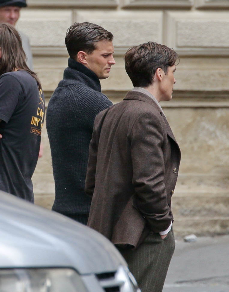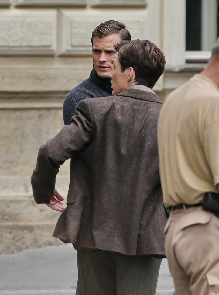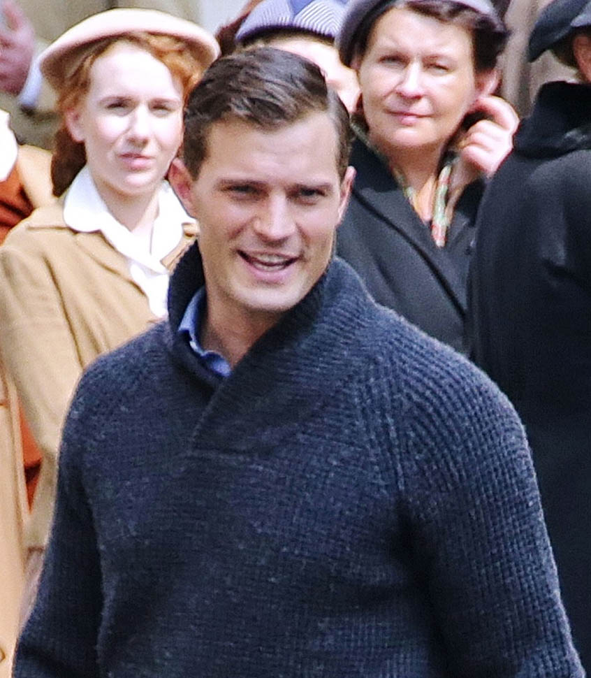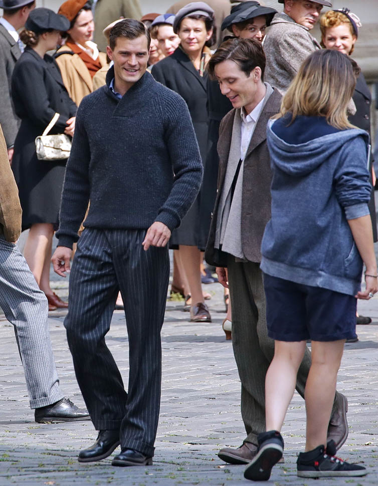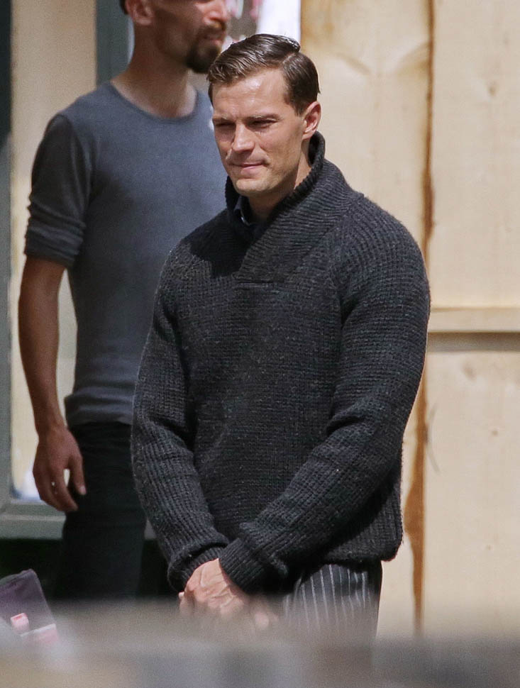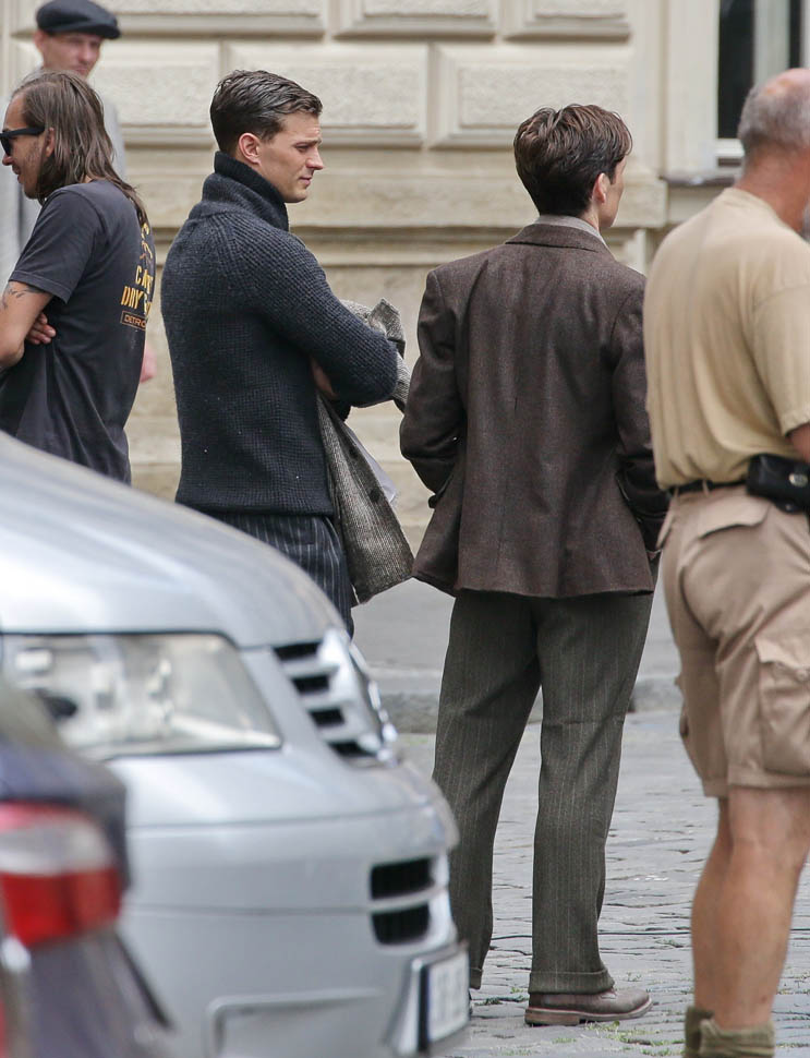 Jamie Dornan is in Prague shooting a movie with Cillian Murphy called Anthropoid. He shaved. His hair is neatly combed. He looks better in these old granddaddy pants than I’d ever expect. And the sweater too. Like really, really, really beautiful. Oh my God, SO beautiful.