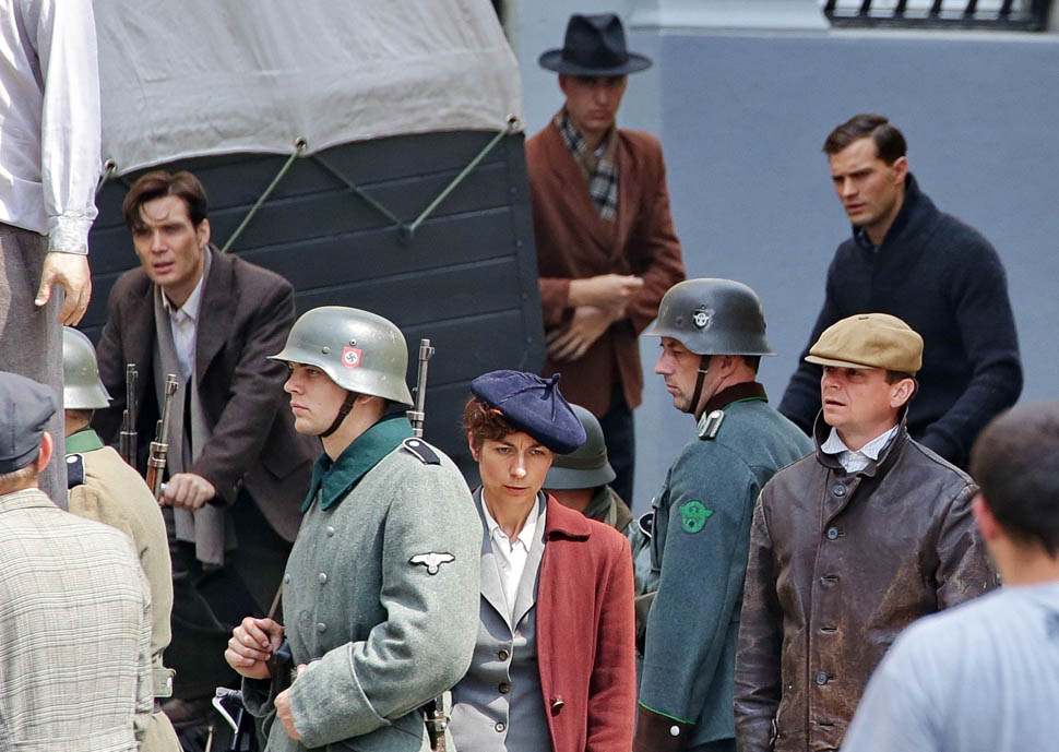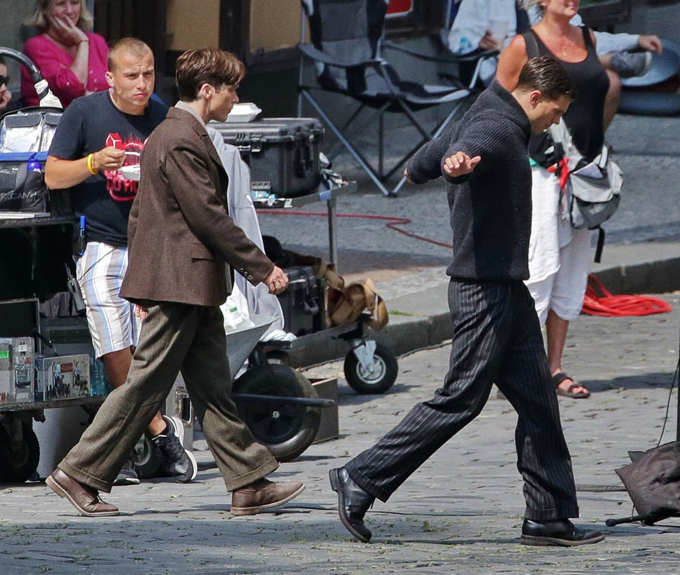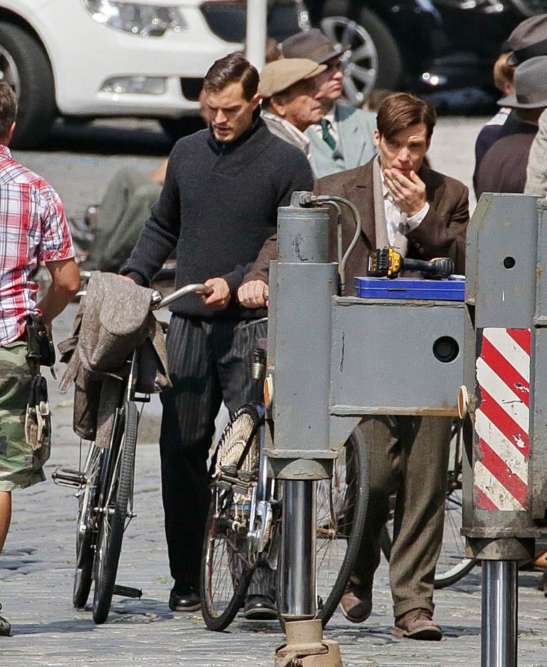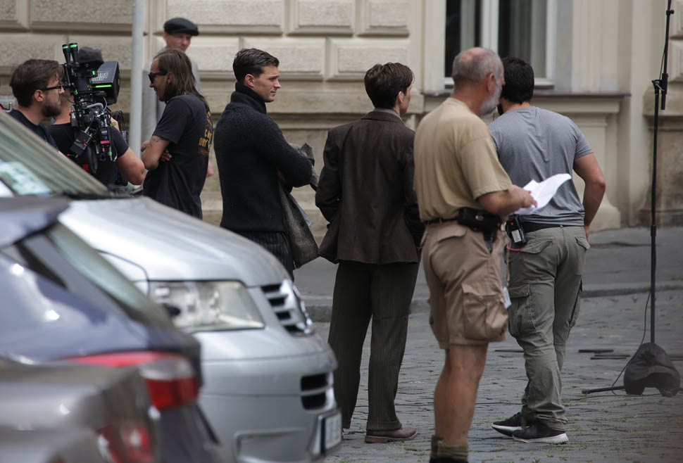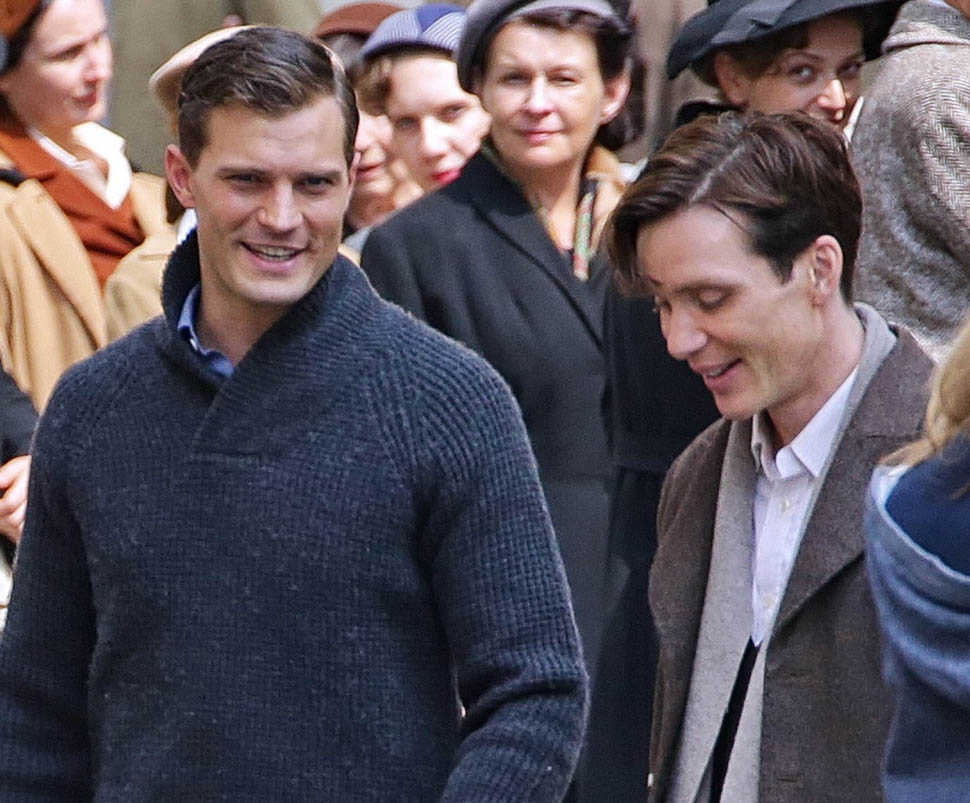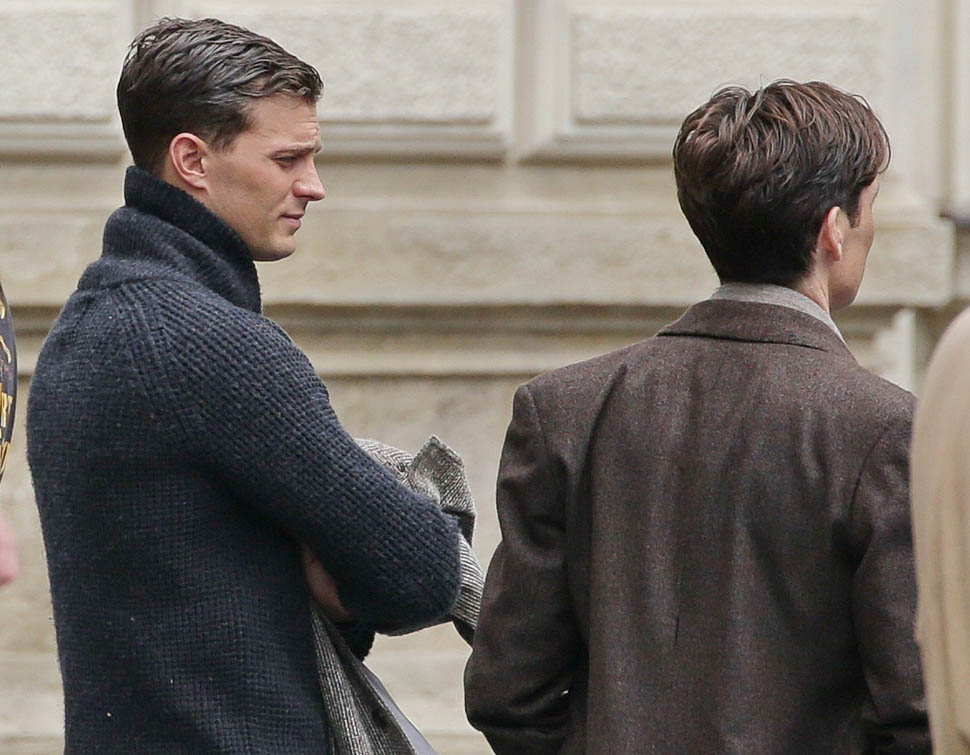 Jamie Dornan is in Prague shooting a movie with Cillian Murphy called Anthropoid. He shaved. His hair is neatly combed. He looks better in these old granddaddy pants than I’d ever expect. And the sweater too. Like really, really, really beautiful. Oh my God, SO beautiful.