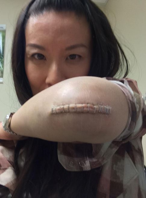 My golf season won’t start until it’s really hot outside and the conditions are perfect. Because I’m not good enough to muck around in sh-t and also… my staples just came off yesterday! This is what my arm looked like right before they took them out.