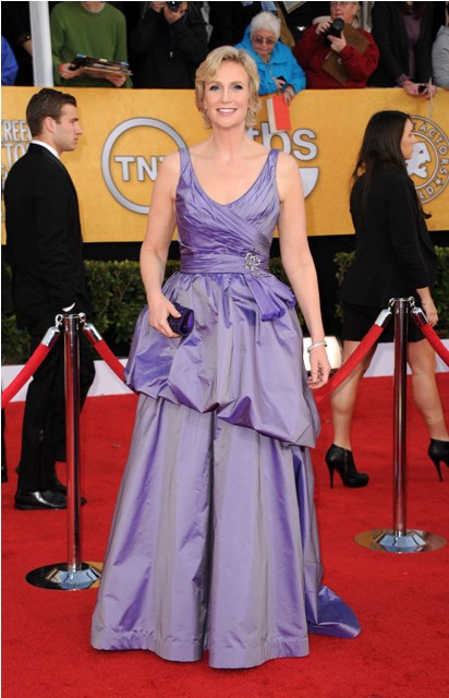 There is not one part of this sh-t that’s salvageable. Not the swimsuit bust line, not the weird pleating at the waist, not the tacky tier around her thighs, not the colour, not the material, I have tried all night and all morning to say ONE good thing about Jane Lynch in this disaster and all I can come up with is… her makeup doesn’t suck. Except of course it’s framed by Florence Henderson’s hairstyle. Now that may or may not be a constraint of the character she plays on her show – fair enough I suppose – but I don’t see why that means they have to take a curling iron to her fringe and feather it out like menopause automatically condemns you to looking like you hate style.