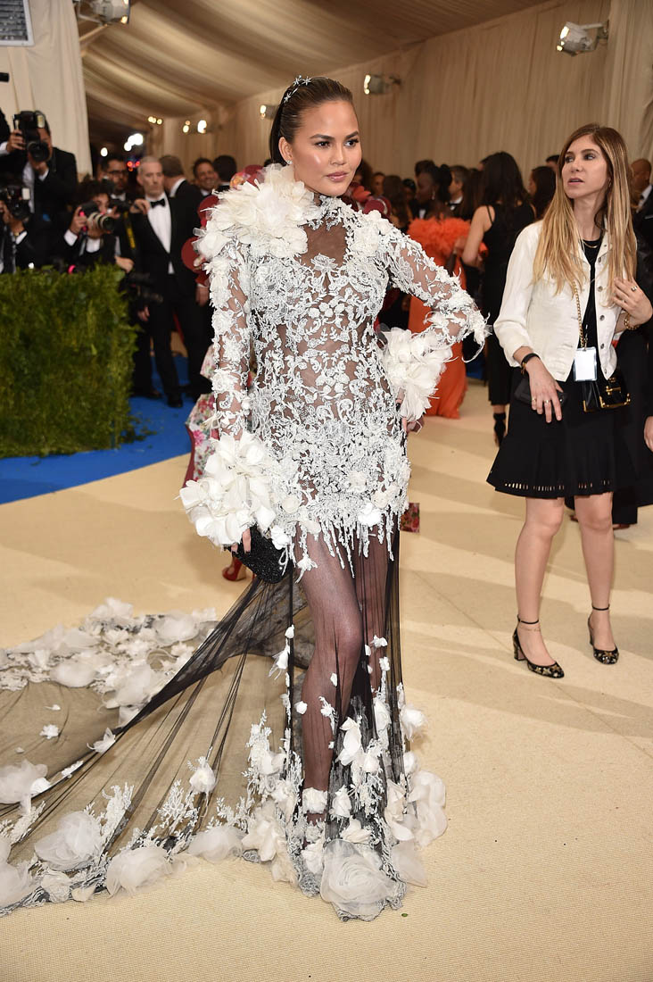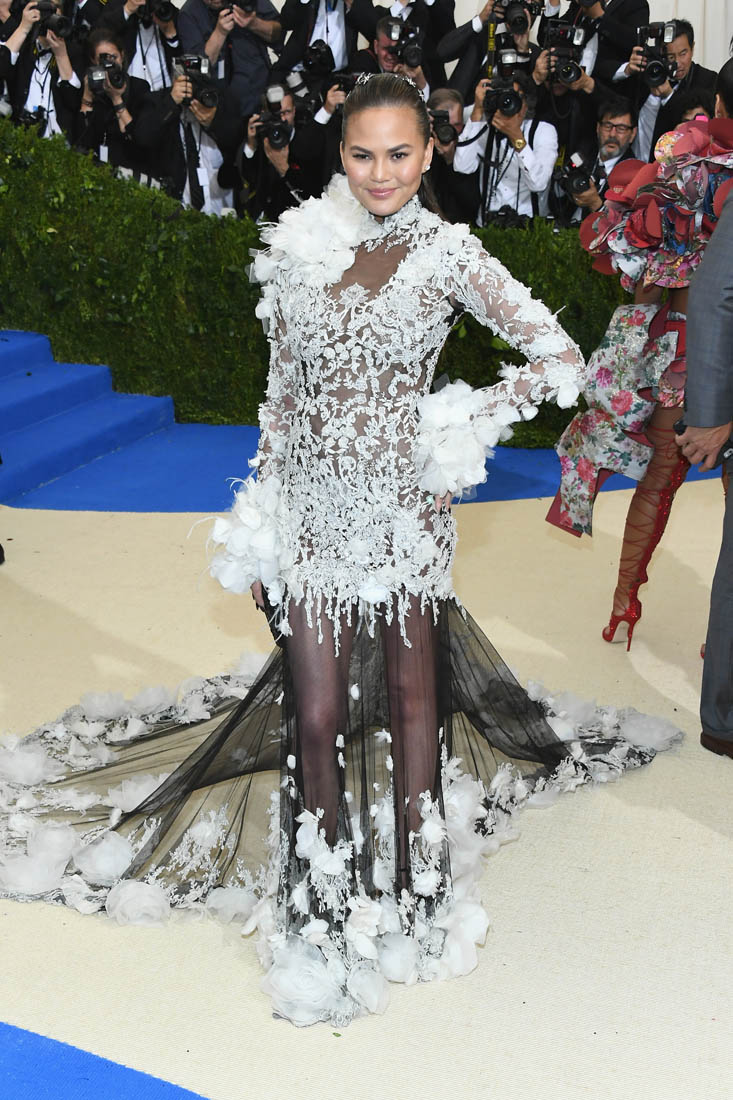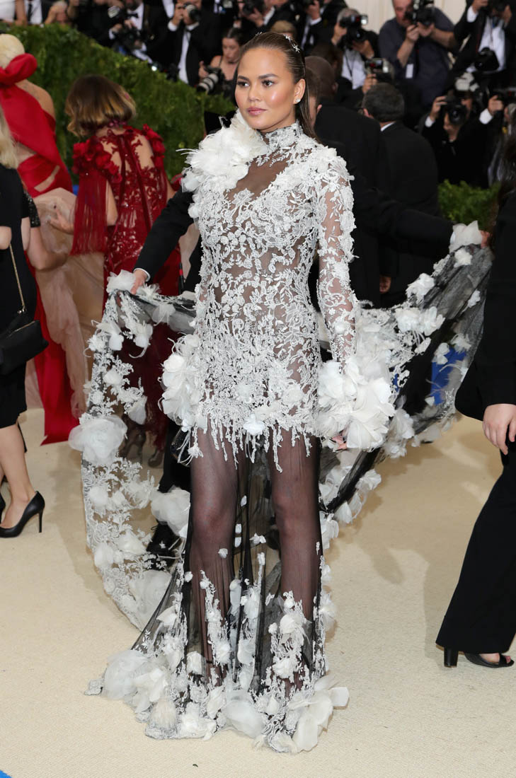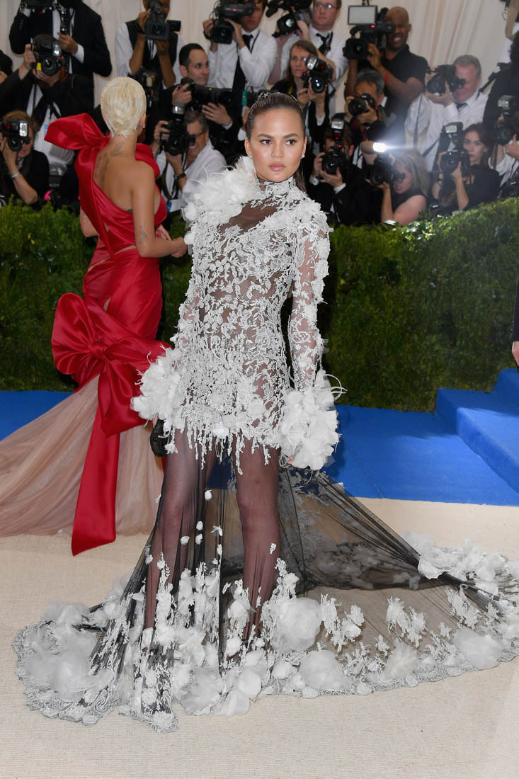 Meanwhile, Chrissy Teigen’s is the more wearable option. You know, on account of how it’s sheer from waist-to-floor. HA. But even here there are moments. C.T. is not dumb. She knows she plays in ‘conventionally pretty’, not so much avant-garde. She told PEOPLE she was holding herself back from going ‘over-the-top’ because she’s made that ‘mistake’ before (I am hard-pressed to find this. If anything, she’s been too understated and traditional) and wanted to stay ‘pretty’…