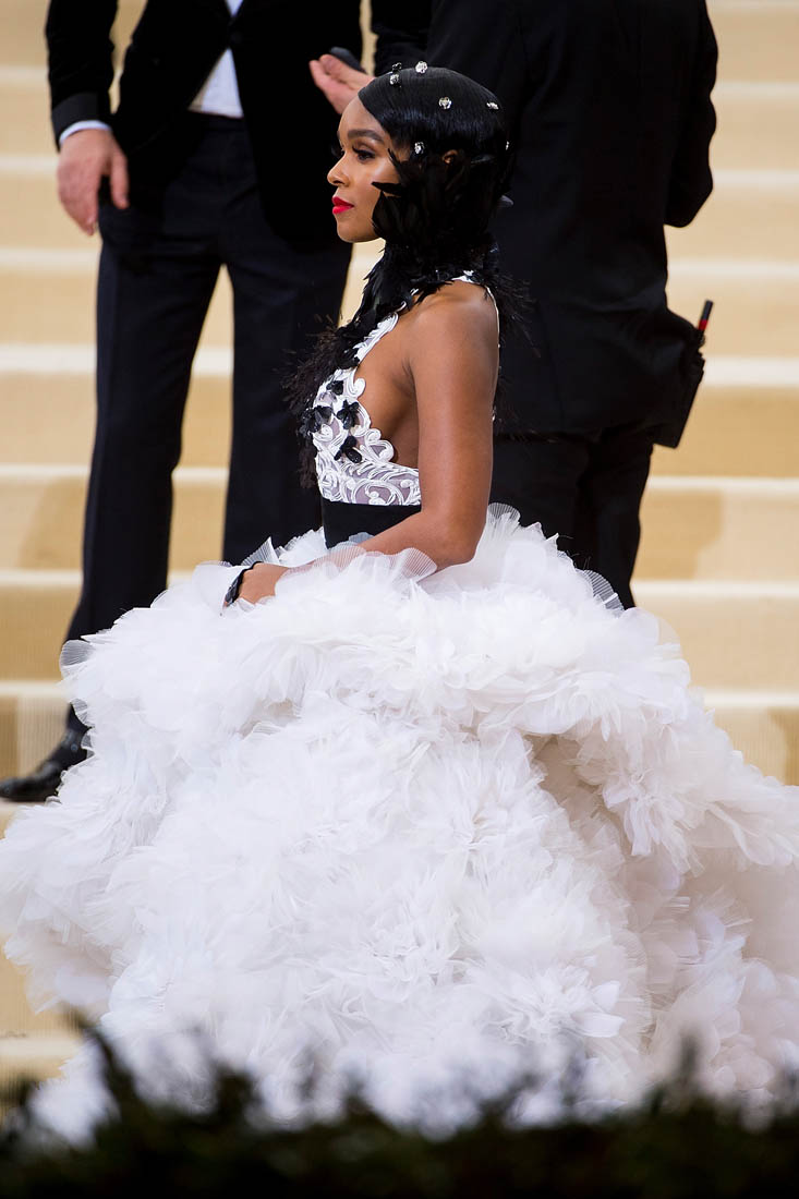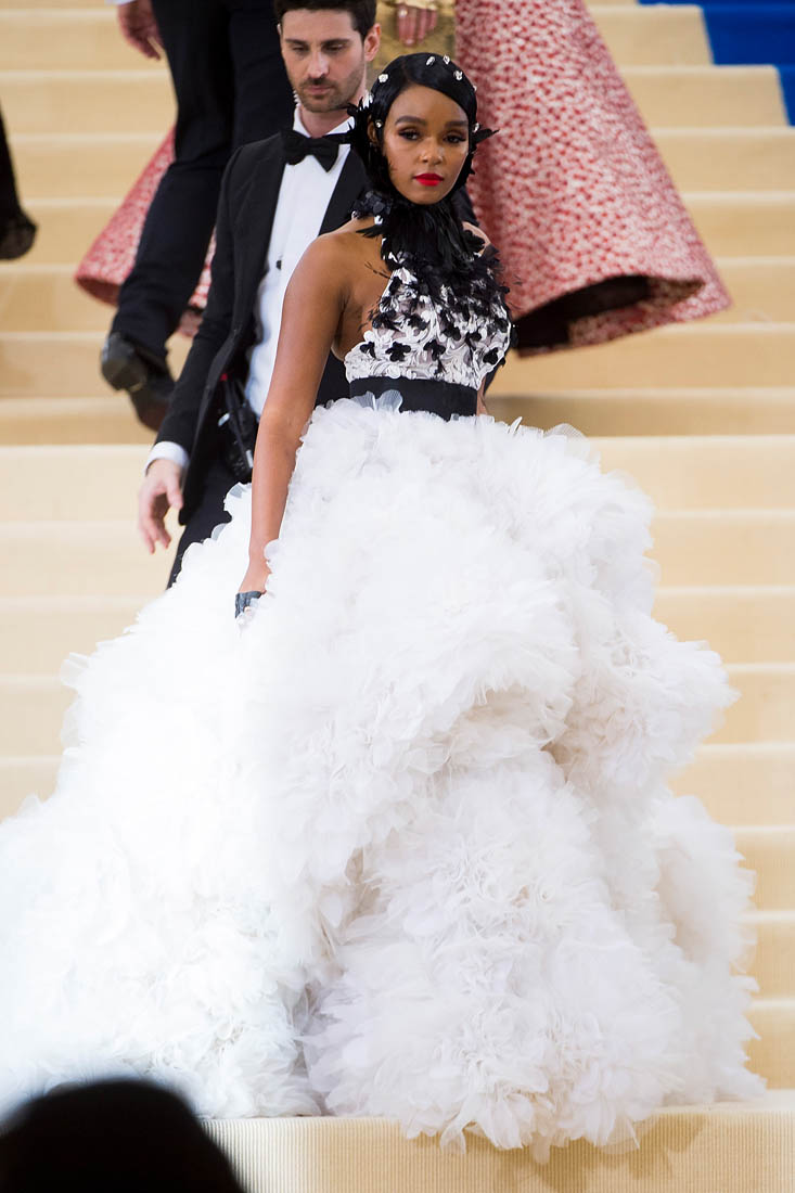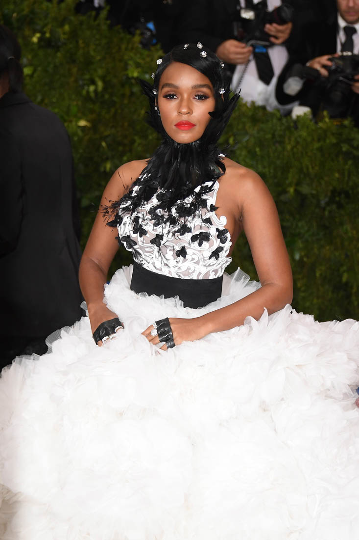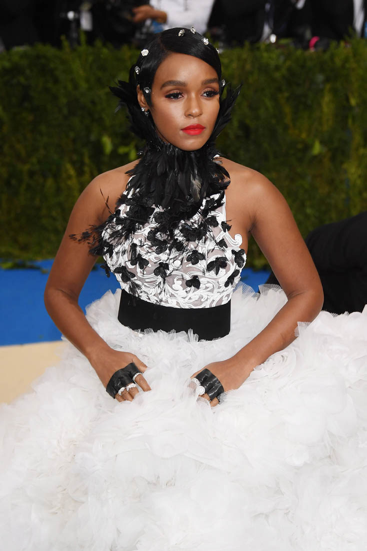 If I knew anything about ballet, it would remind me of Swan Lake. She keeps her makeup so simple (because she can, because Janelle Monae) so that we can take in how her neck rises from the structure of the thing, and how she has once again used her hair as an outlet for accessories. Then there are the tiny little … what are those, knuckle-warmers? … that just pop every time she has her hands on her skirt, which is all the time because said skirt is everywhere.