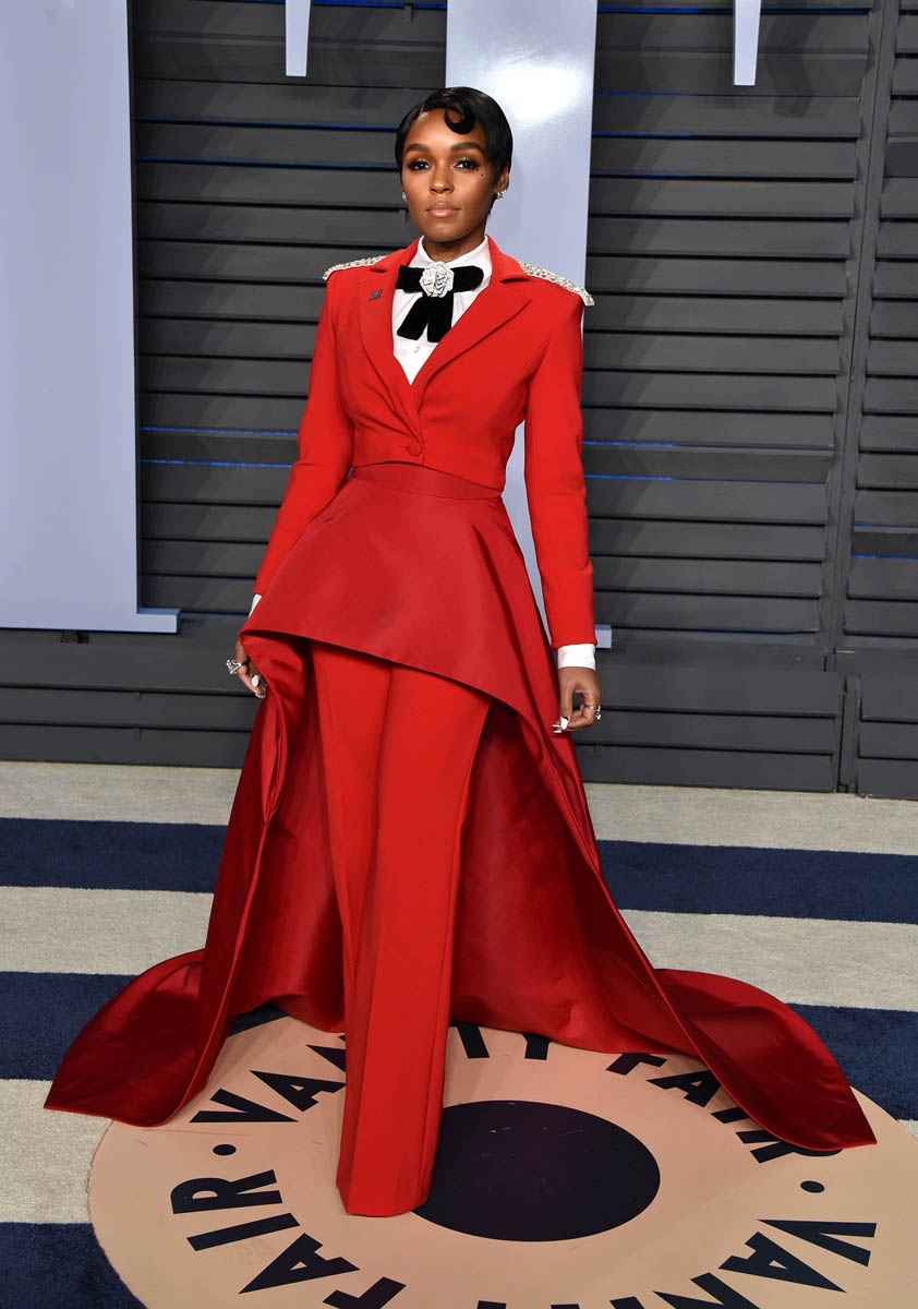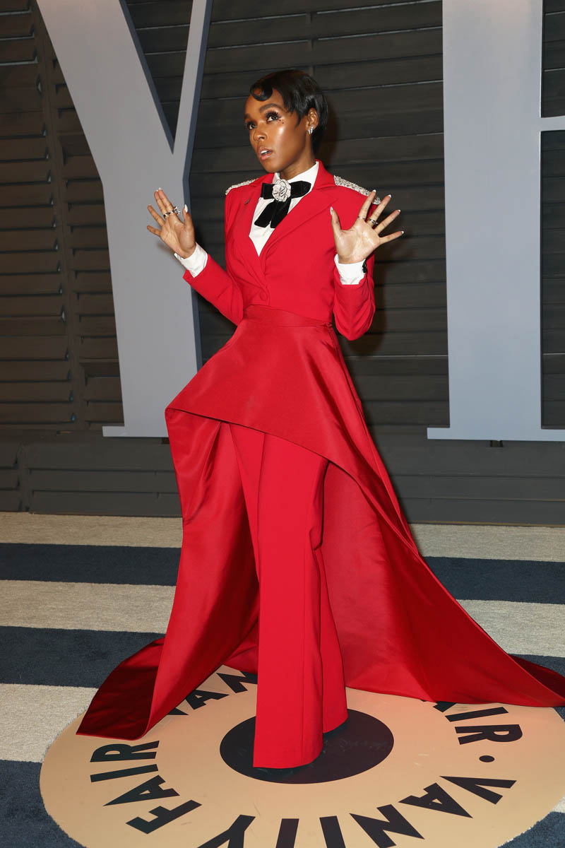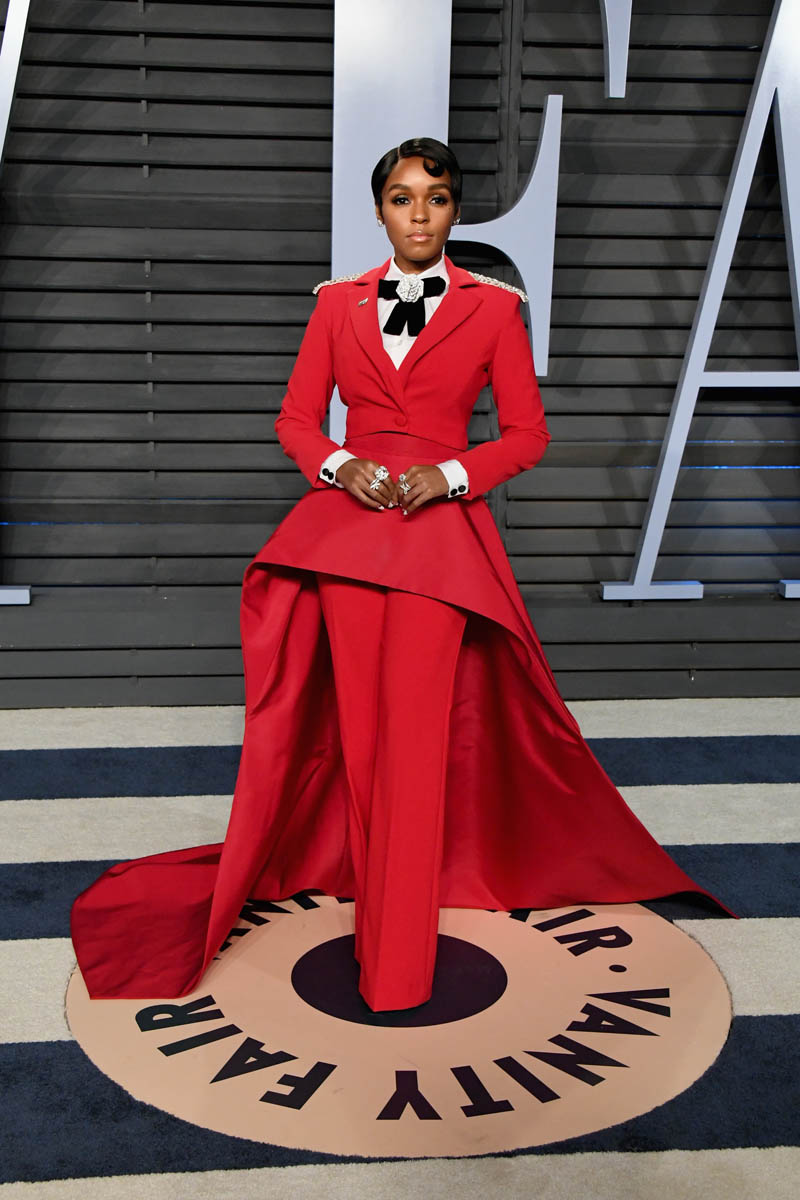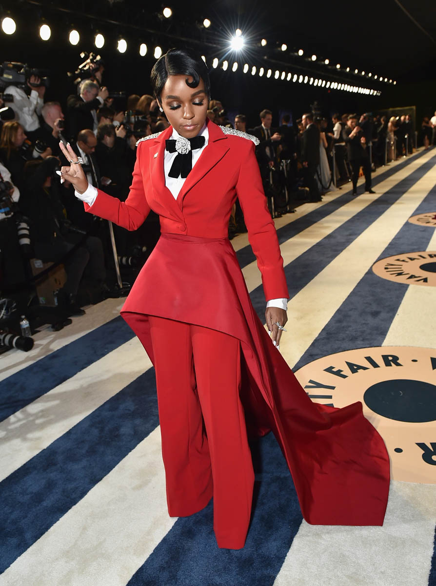 Janelle Monae’s solo arrival shots at the Vanity Fair party are even more impressive. She’s giving the Beyoncé Single Ladies hand in most of the shots, presumably to show off her rings. Everything about this look is FIRE. The structure of the waist is stunning. The pants fall in the exact right places. The train is flawless. The bedazzled rose bowtie? I can’t compute. It’s too much. We know Janelle Monae loves a suit but this is next level. It may just be my all-time favourite look on her. It’s custom by Christian Siriano. He must be from 2067 too.