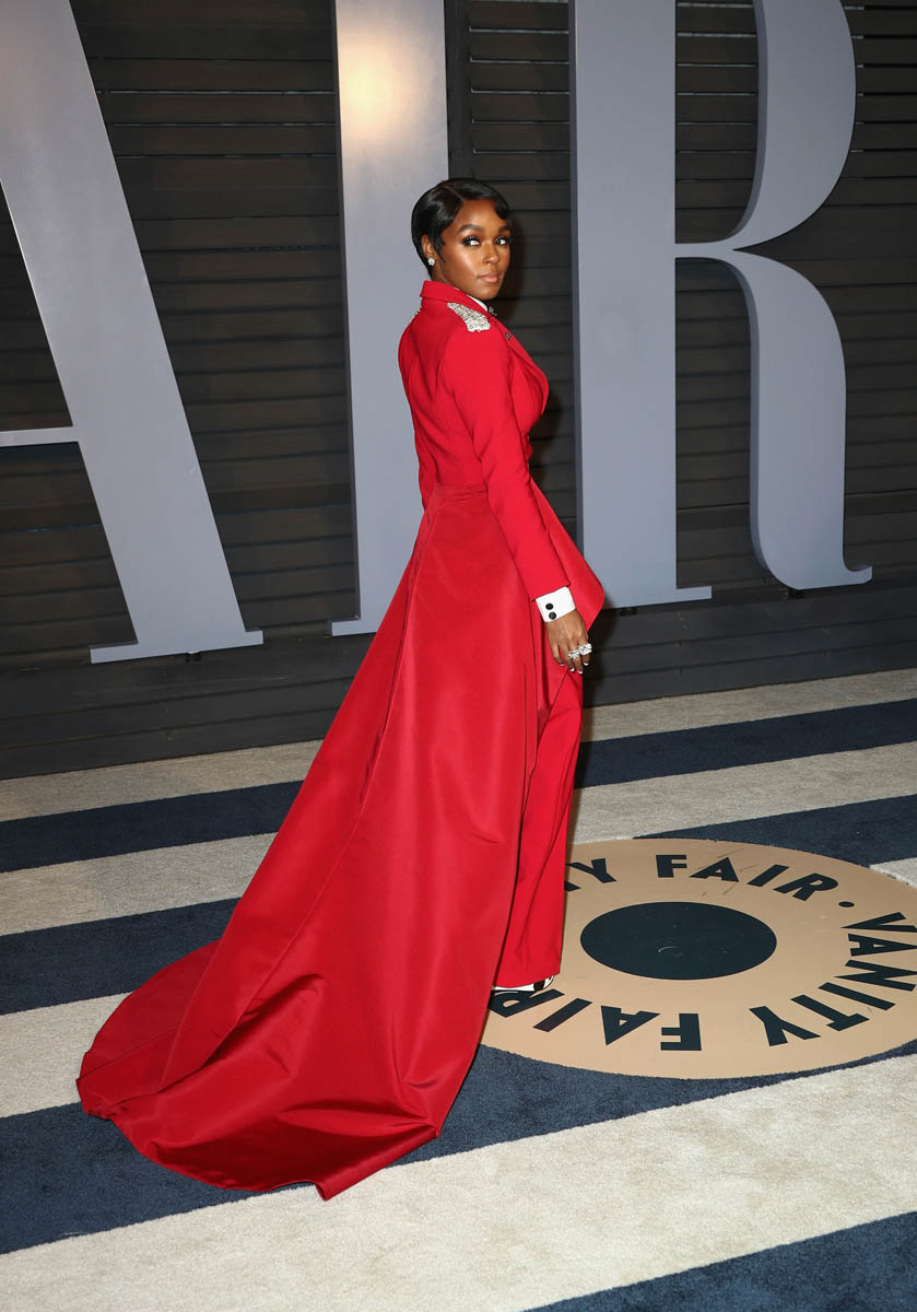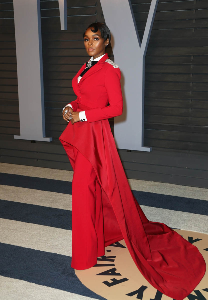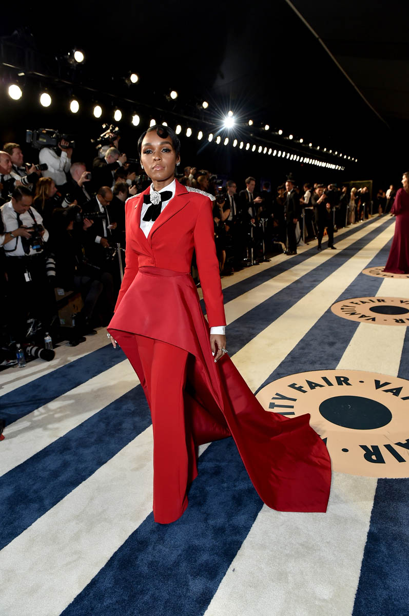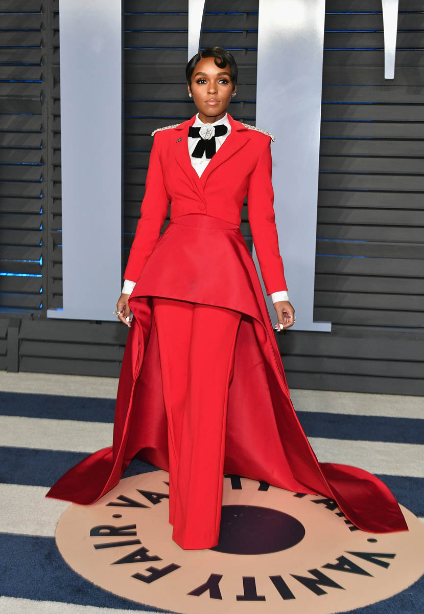 Janelle Monae’s solo arrival shots at the Vanity Fair party are even more impressive. She’s giving the Beyoncé Single Ladies hand in most of the shots, presumably to show off her rings. Everything about this look is FIRE. The structure of the waist is stunning. The pants fall in the exact right places. The train is flawless. The bedazzled rose bowtie? I can’t compute. It’s too much. We know Janelle Monae loves a suit but this is next level. It may just be my all-time favourite look on her. It’s custom by Christian Siriano. He must be from 2067 too.