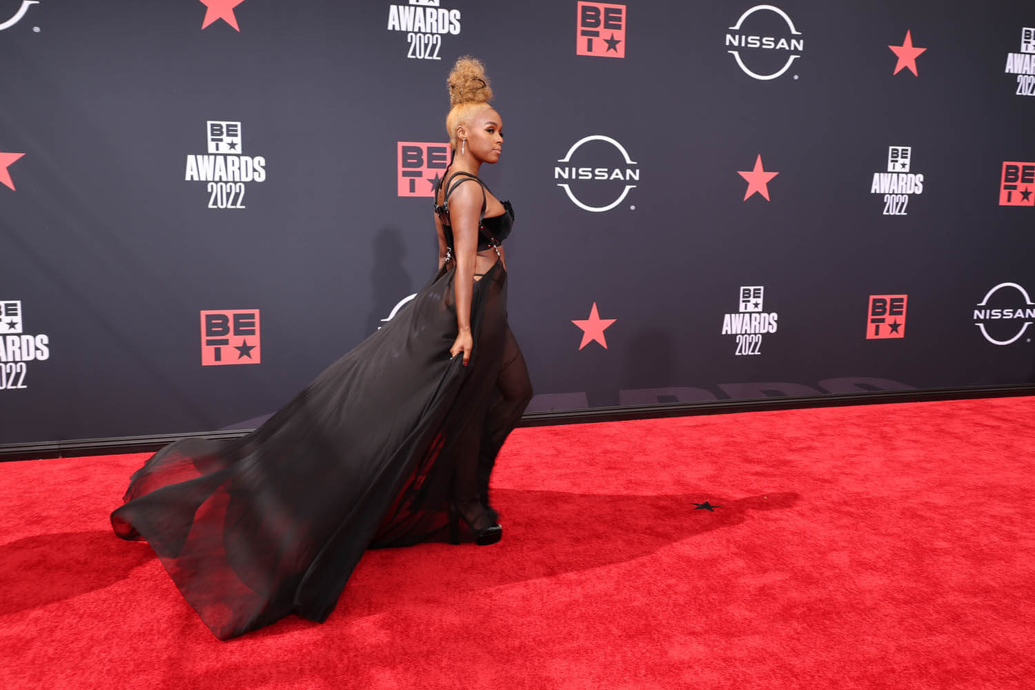Best dressed for me at the BET Awards is Janelle Monae. Because before the show I would never have predicted that this would be her look. Not that it doesn’t suit her – look at her, of course it suits her. The bondage energy on top, the zigzag cut around the waist, the sheer skirt, her hair piled up in an oversized topknot, all of this is gorgeous.