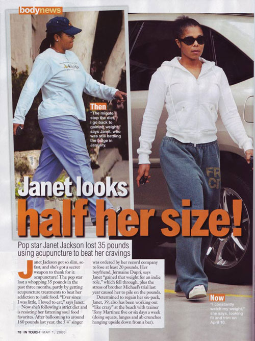 I seriously don"t understand why everyone is losing their sh*t over Janet"s current weight loss. It"s about as interesting as Oprah on another diet. Here"s a scan from this week"s In Touch, a sickeningly stupid piece about how wonderful she looks and how she dropped pounds. I mean really gossips…is this news? Over the last 10 years, Janet Jackson"s pattern has always been the following: - eat like there"s no tomorrow and do nothing all day - get depressed about being overweight and having a f&cked up family - head to the studio for a new album - use depression and issues related to having f*cked up family to write new songs - record new album and rediscover "girl power" - realise that it"s important to love oneself and be healthy - finish new album and get trainer - eat, work out like a frickin" maniac, and inspire others to do the same - release new album, pose in a variety of photographs while squeezing fake tits together, and talk about "heavy emotional journey" that was required to make new music - sell millions of copies, go on tour, make more money - eat like there"s no tomorrow and do nothing all day - get depressed - head to studio for new album - etc etc etc Let"s take a stroll through her recent diet chronology, shall we? Starting with a look back at JJ, tight ass all hell during All For You in 2002…I love that song. Fast forward a year and she"s hefty while shopping on her own and with LaToya in early 2004. Twelve months later, at the Grammys with her man in February 2005, Janet was slim again for Damita Jo. And of course, by the end of 2005 - just six months ago - she had put it all back on. Now don"t get me wrong. I LOVE Janet. I have loved her my whole life. And sure - I suppose it"s …um…unique that she can gain and lose at will. But me personally? I won"t applaud yoyo body abuse. It can"t be healthy. And, throwing Janet and her rather unstable diet addiction up as an example of a successful weight loss story is about as irresponsible as glorifying the young Hollywood anorexics running the show in Hollywood these days. Next please.