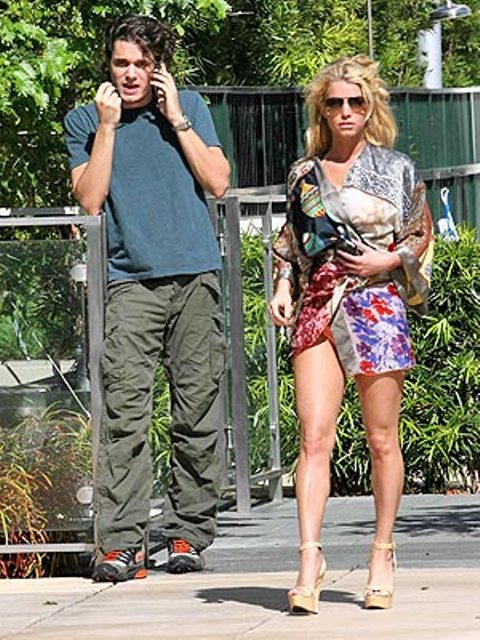 The Look of Shame again prominently displayed at the weekend in Miami as John Mayer continues to suffer the indignity of being seen in public with Jessica Simpson, to the amazement of his fans and supporters who are increasingly bewildered by the surprising longevity of this relationship. I mean screwing her is one thing, but are they actually… Conversing??? And if John Mayer can withstand a conversation with Jessica Simpson, other than “faster bitch and not so hard”, what exactly does that say about his own intellectual standards? More importantly though – why in ass is she dressed like a prostitute??? It’s the legs, I think. The trannified legs in combination with those platform shoes – the kind of shoes that belong in a massage parlour with acrylic nails - cheap and skanky no matter how much they cost and on Jessica Simpson, who will always smell like chicken fried trailer scum, pairing it with a child-sized kimono makes it that much more Low Classy. But enough about Jessica Simpson. Jessica Simpson is not the loser in this situation. Jessica Simpson is actually comin’ out pretty good. John Mayer, on the other hand, as my mother would say, is comin’ out welly welly bad. Even worse… he’s starting to resemble Michael Jackson. Check out this photo posted on People from last Friday – there’s some weird cutting goin’ on around the nose area, non? And the lips…don’t the lips look kinda waxy plastic? Doesn’t his entire head look waxy plastic? See what happens when you exercise your c*ck at the expense of your brain? I’m telling you…three more weeks of this and John Mayer will be virtually unrecognizable. Source