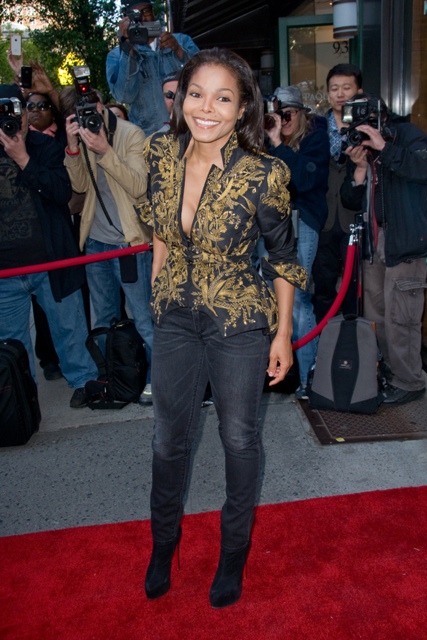 The embroidered jacket over jeans is a very good look for Janet Jackson. Flattering at the waist and shoulders, and I like the flare detail in the back. Her best showing in a long, long time.