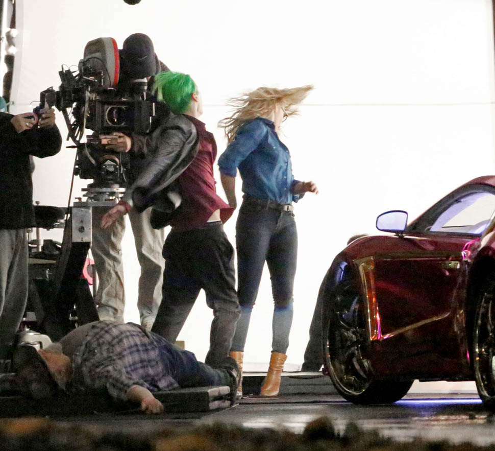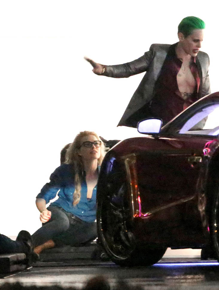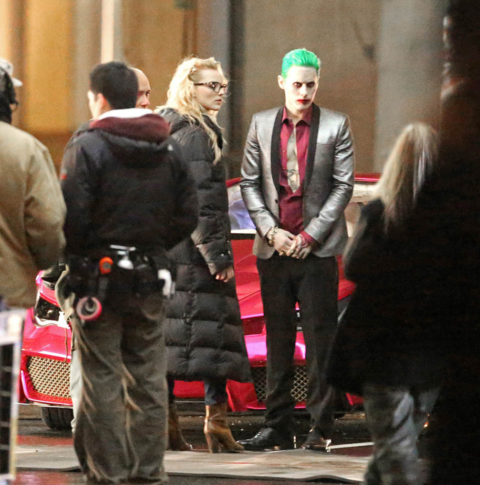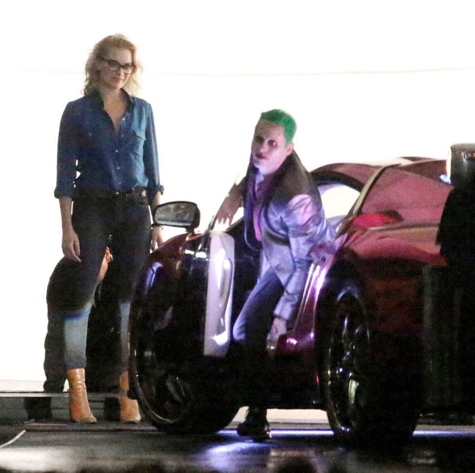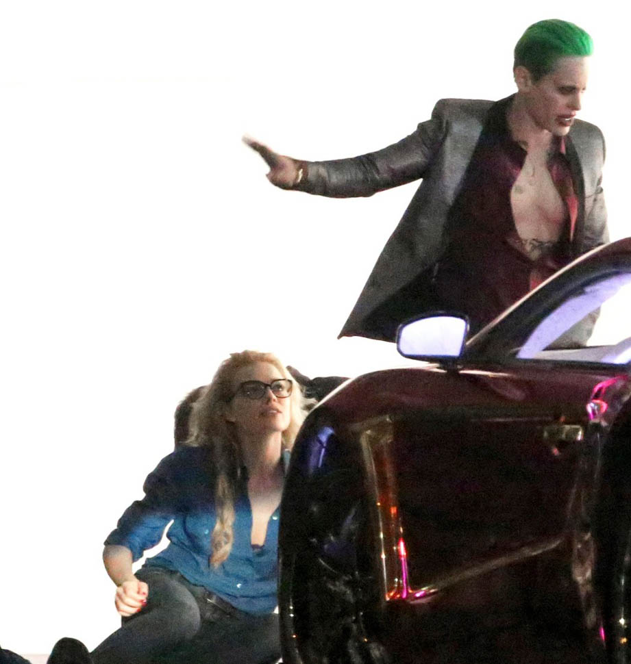 I’ve been cautiously optimistic about Suicide Squad, mostly based on the direction of David Ayer and the presence of one of my favorite comic book characters, Harley Quinn. A couple weeks ago we got a look at the Squad, dubbed “Task Force X” for the movie, in their costumes, but for one notable absence—Jared Leto as The Joker. But new set photos from Toronto give us a clear look at Leto in Joker attire, complete with silver lamé jacket and dumbass grill. He’s seen getting out of a purple Lamborghini (I think it’s an Aventador), dressed like the meth-head offspring of Marilyn Manson and a Vegas lounge lizard.