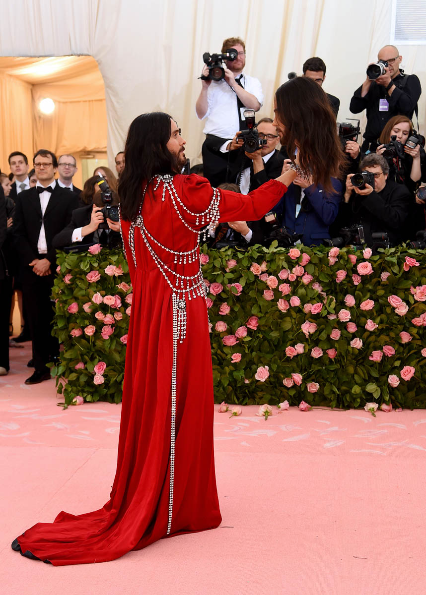 Jared Leto is always in Gucci so of course he was going to be looking like this, but if he’s always in it, is it Camp? Can something this expected be ridiculous? Yesterday Lainey wrote about Keanu and how others, like Jared Leto and Johnny Depp, could never. Never ever. Can you imagine Keanu rolling up to the Met Gala? Never!