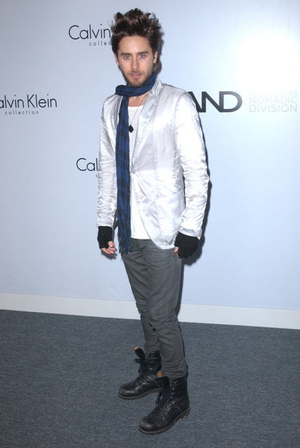 Jared Leto showed up at a Calvin Klein event last night trying to resurrect his acting career with his hair… I guess. For someone like Robert Pattinson and the hair hysteria that exploded ovaries in tandem with his meteoric rise, it worked in that case because it seemed genuine. He just has messy hair. He twitchily can’t stop touching it, an attribute that is almost accidentally endearing.