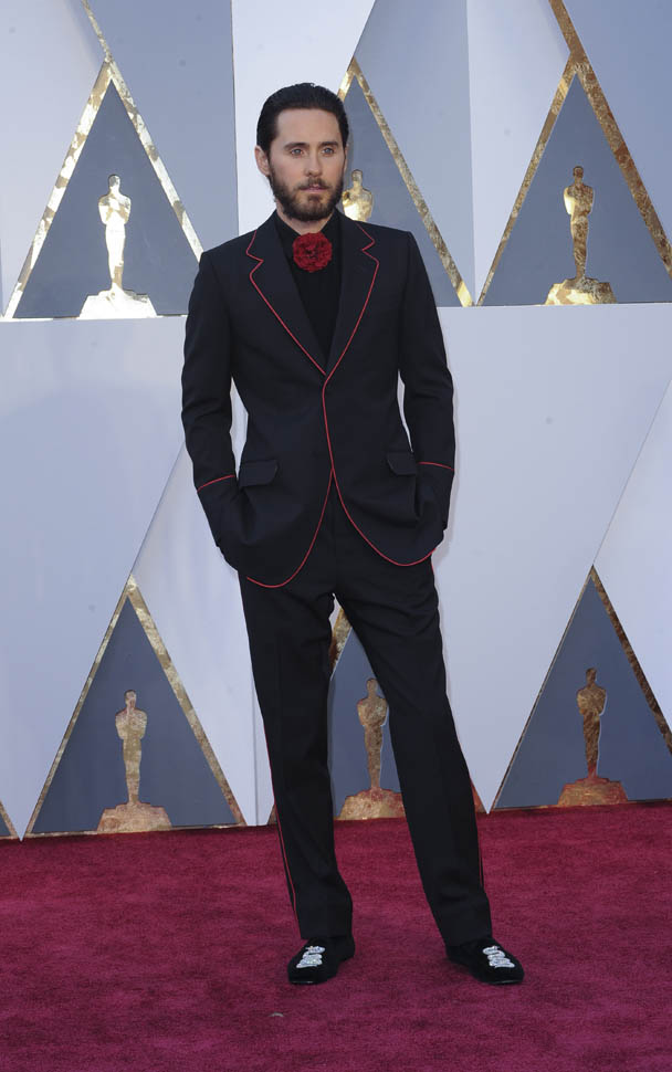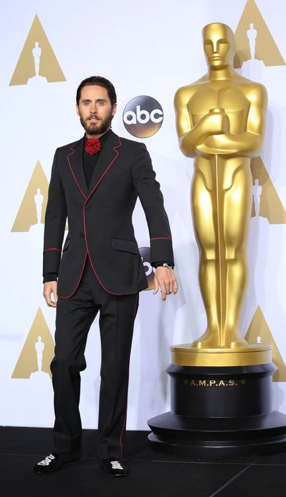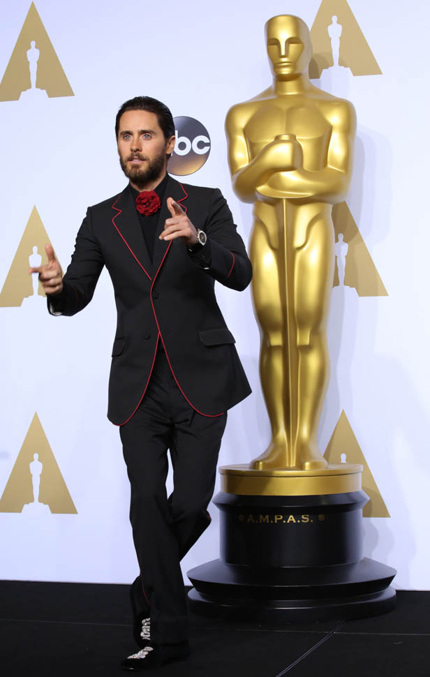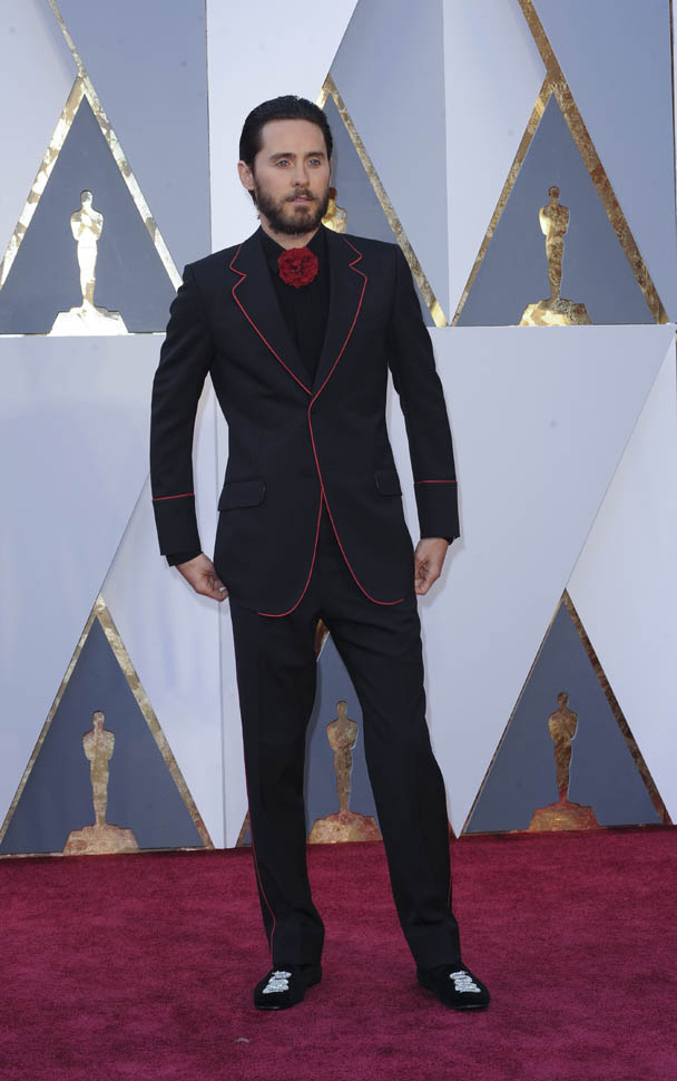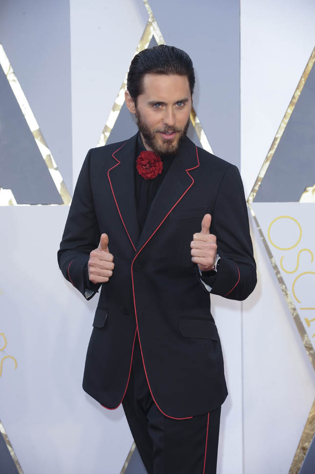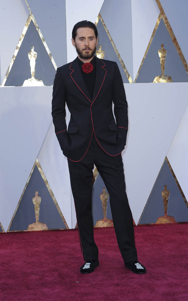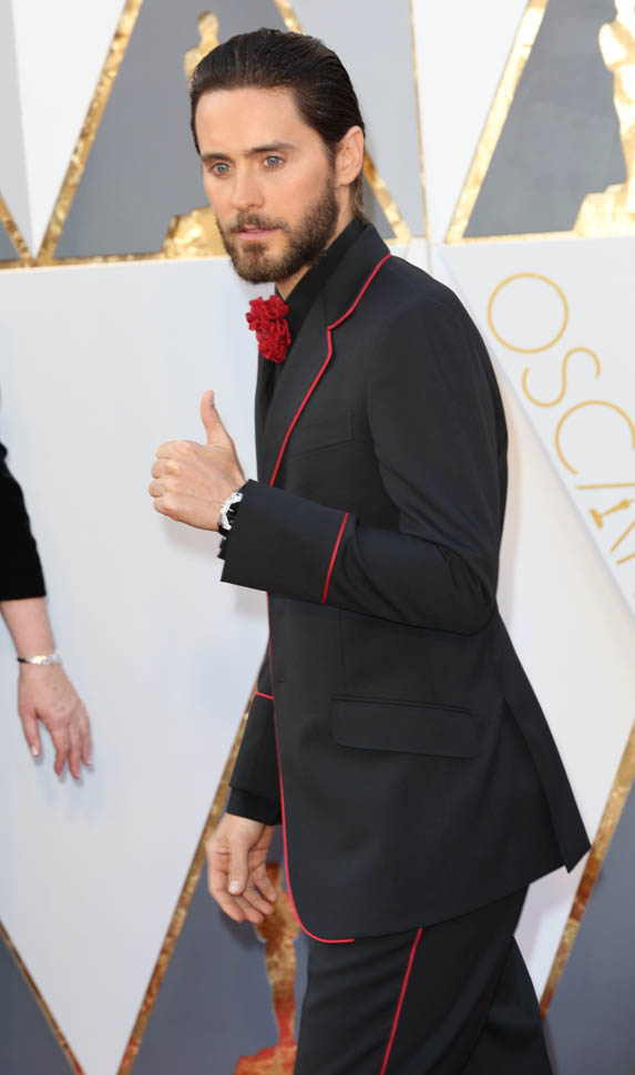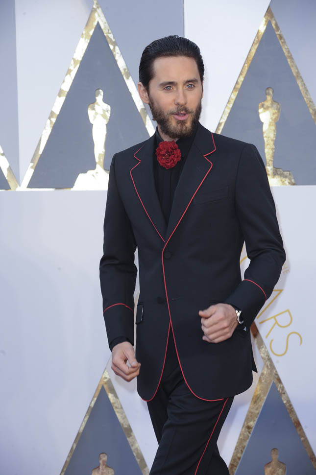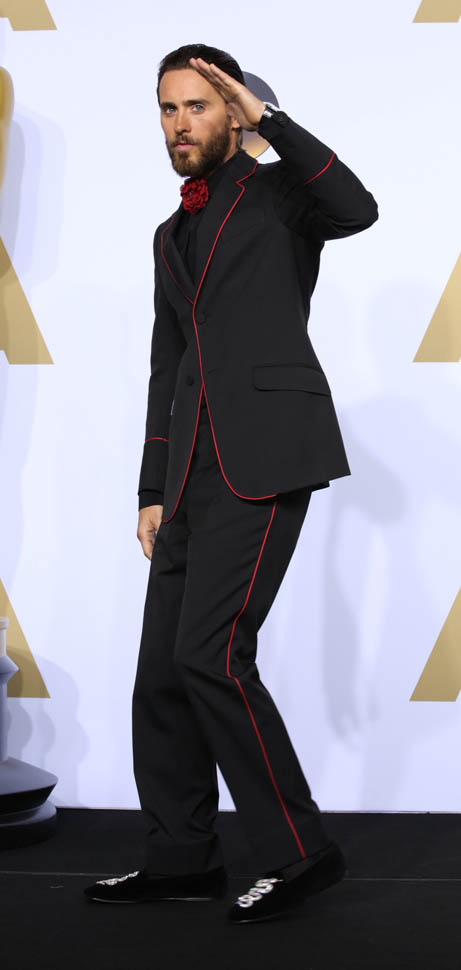 I think at this point we can all assume that Jared Leto is not going to come to the Oscars in a conservative tuxedo. The year he won was about as conservative as it would be – white jacket, black pants, but there was still the red bow tie, and, of course, the hair: