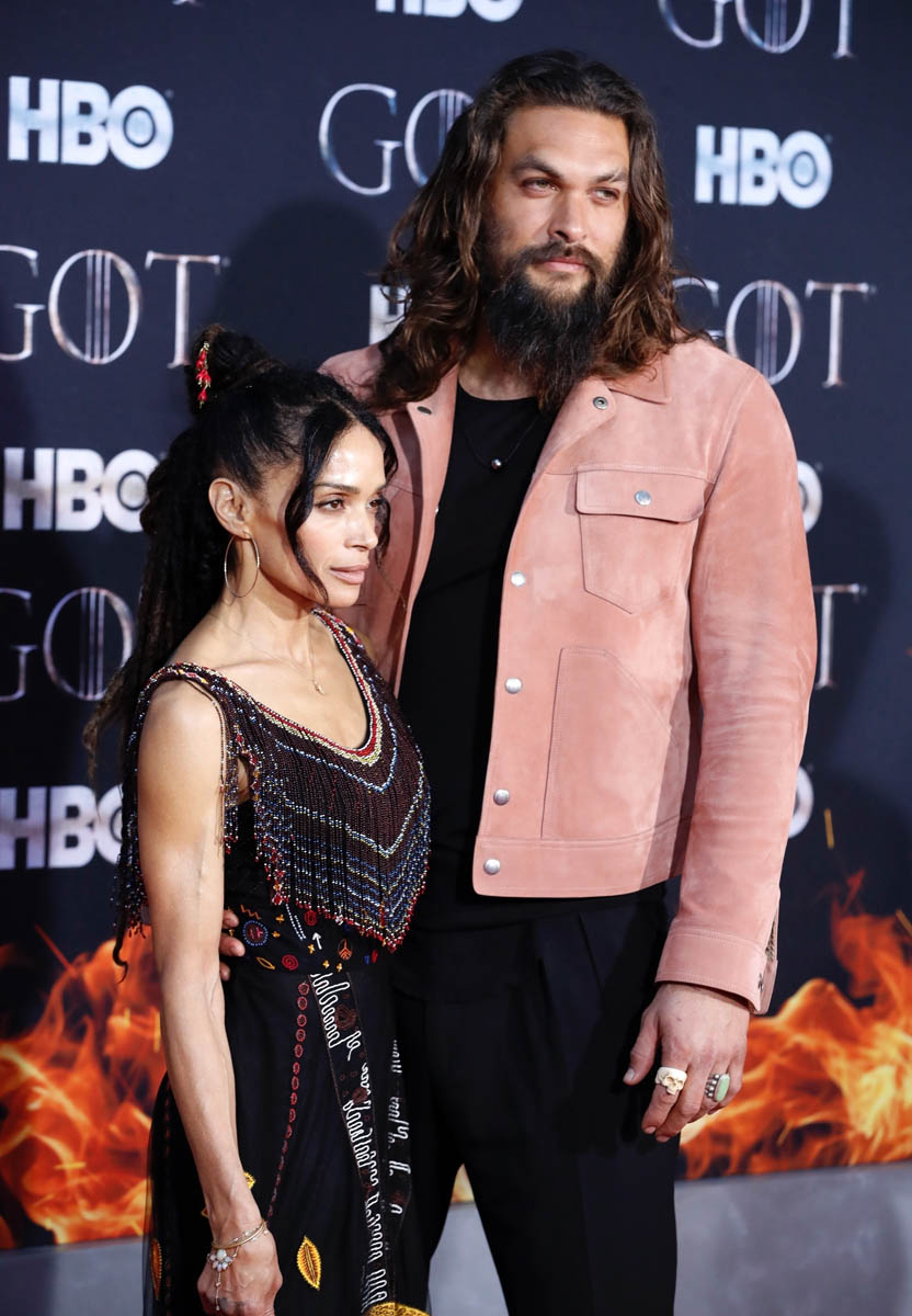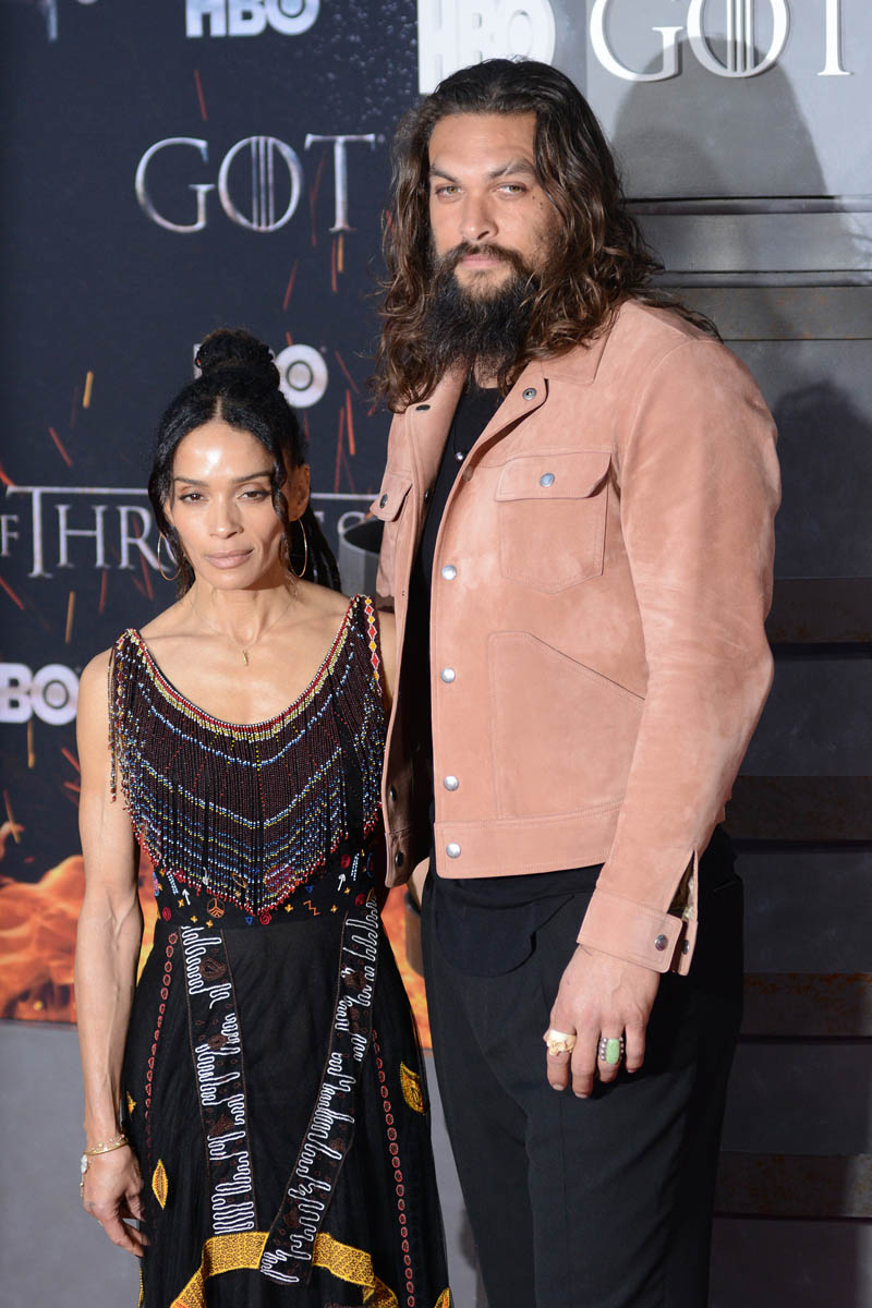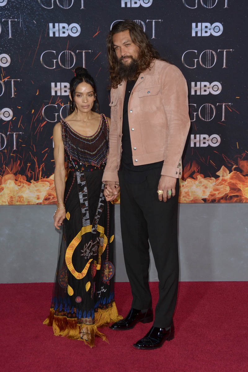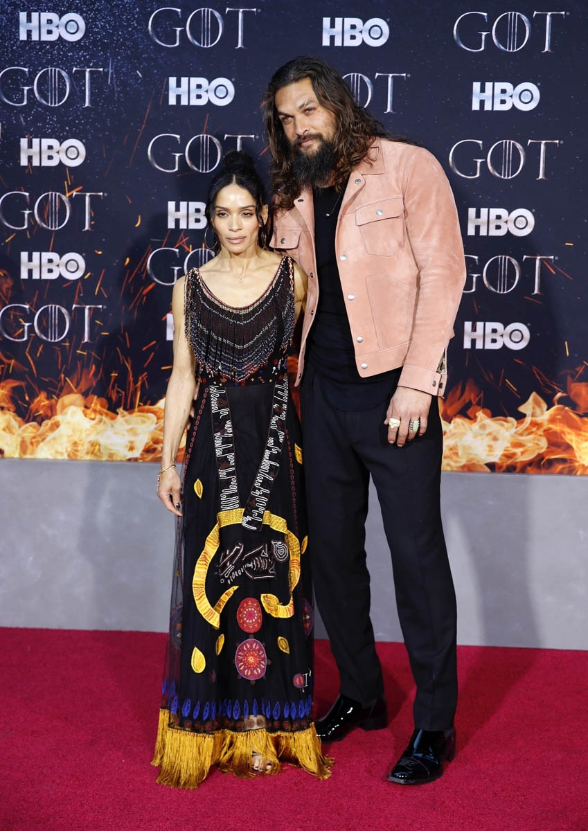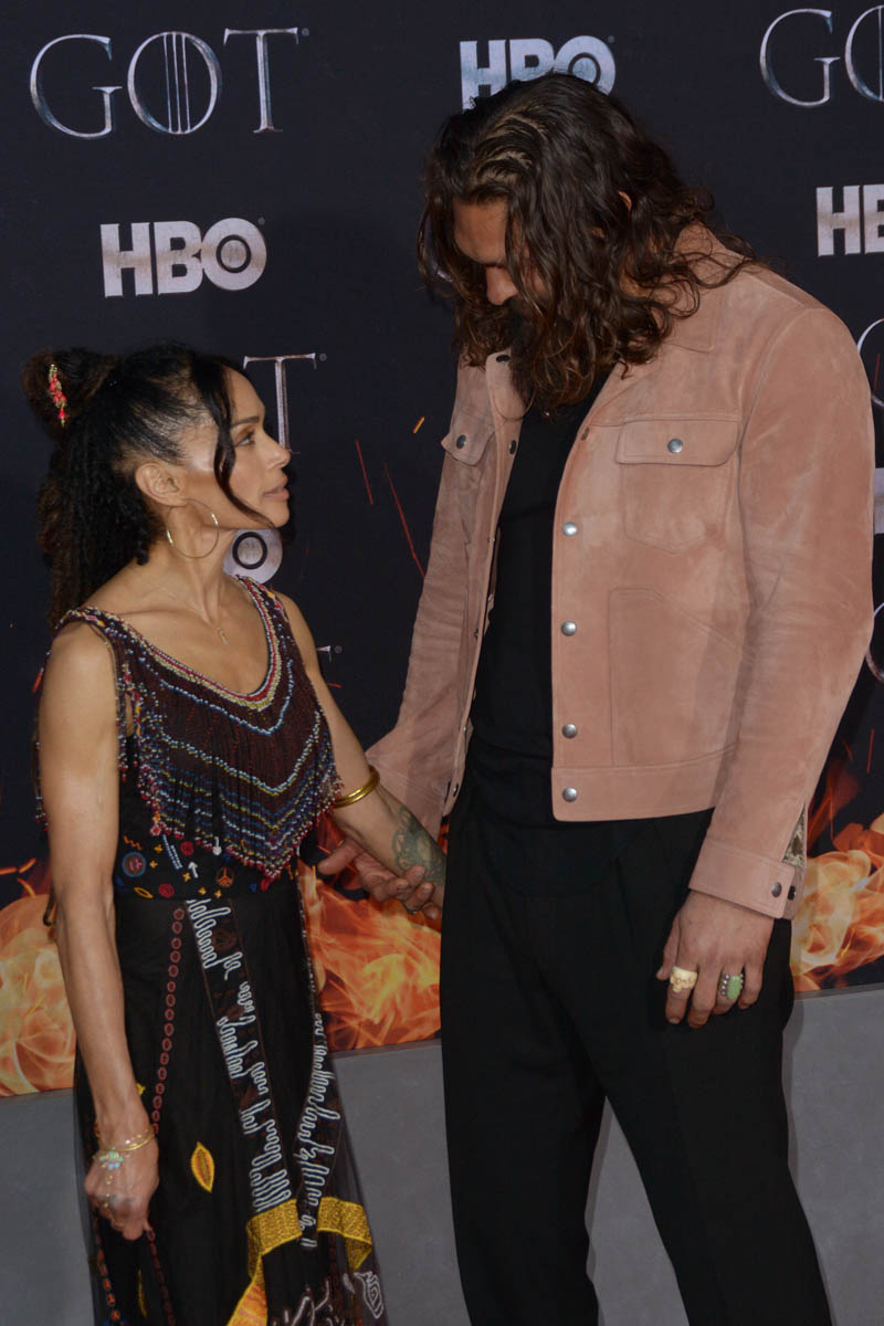 Khal Drogo returned to Game of Thrones, kind of, as Jason Momoa turned out for the Game of Thrones premiere. He came with Lisa Bonet, because everyone’s favorite couple is contractually required to appear on all red carpets together. Sadly, they did not color coordinate this time, and there was no matching velvet scrunchie for Momoa. But Lisa Bonet did show up in a cape, and Momoa is wearing a pink suede(???) jacket, so they’re still appropriately sartorially interesting, and incredibly hot standing next to one another.