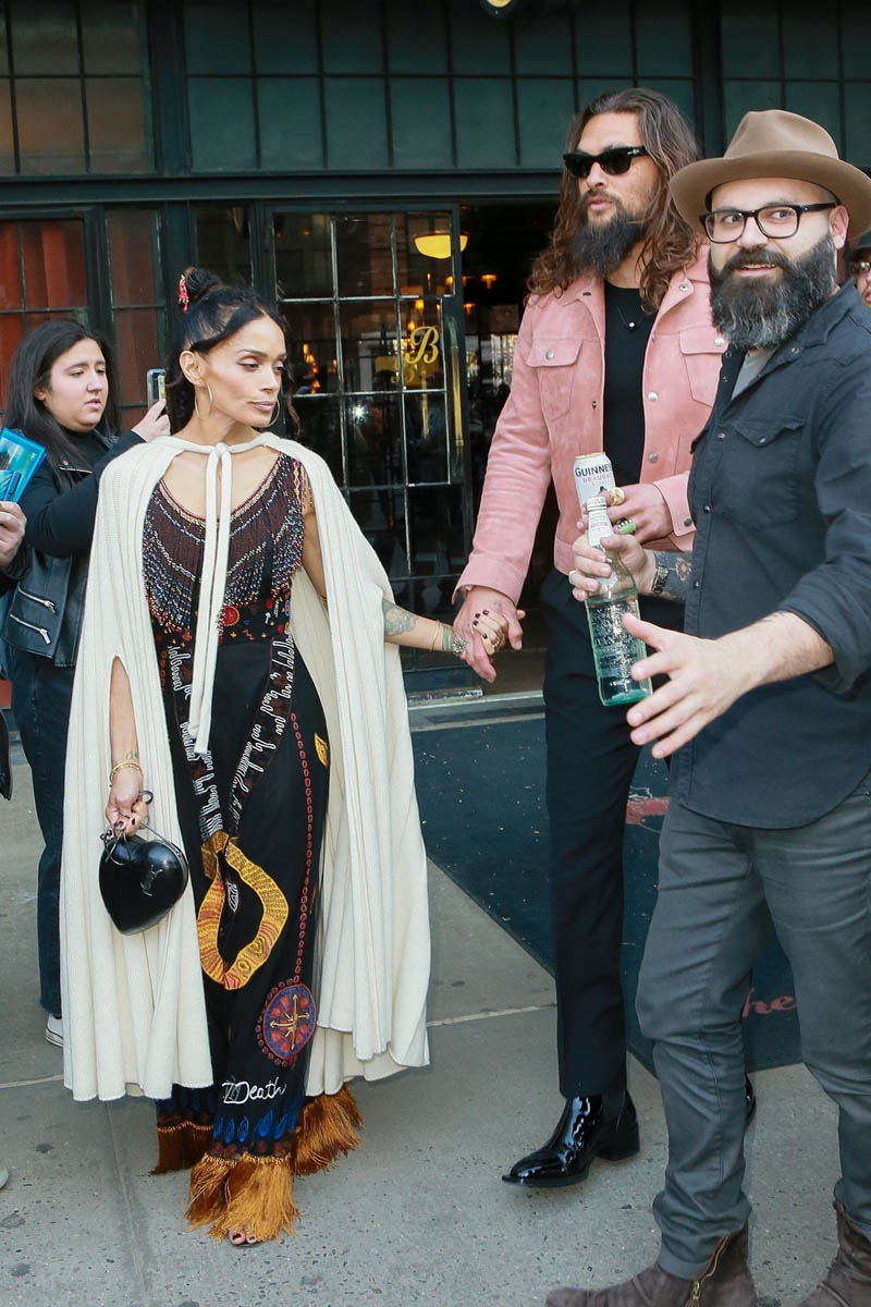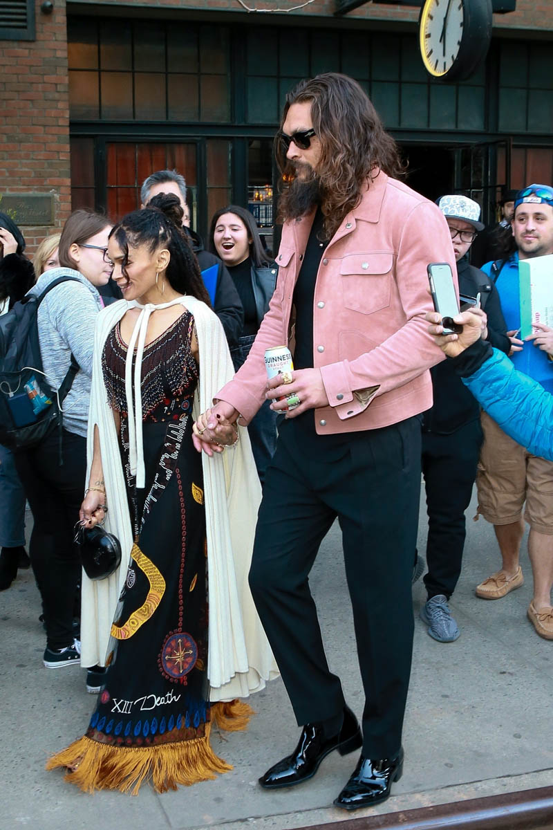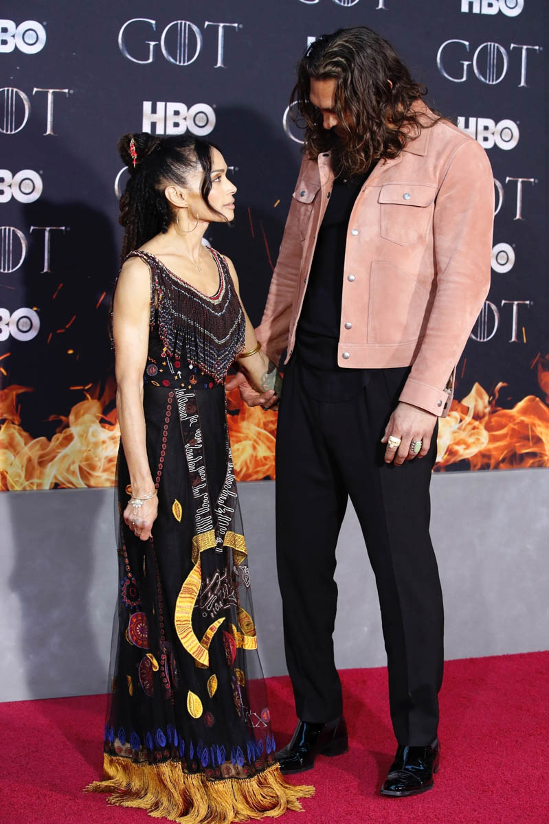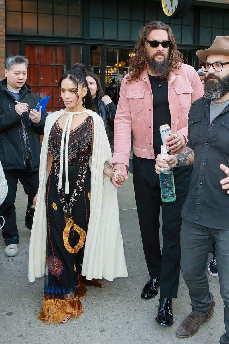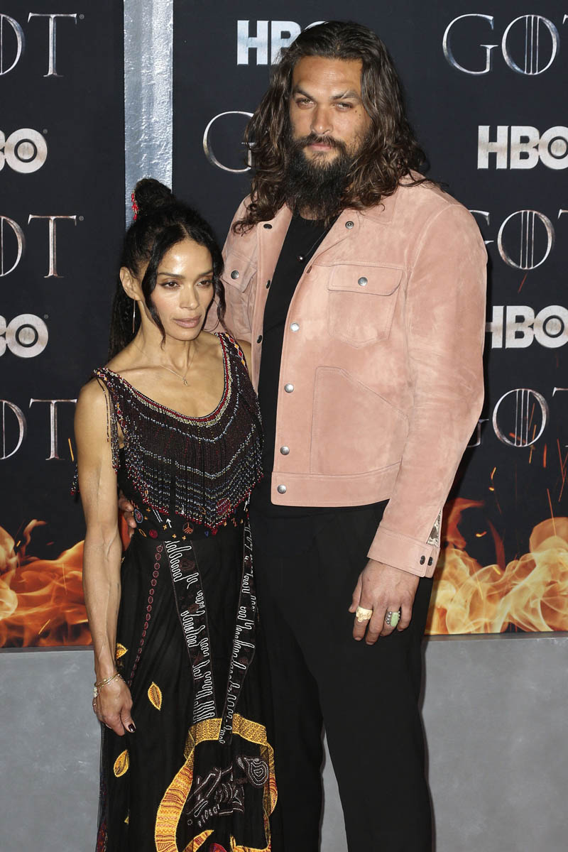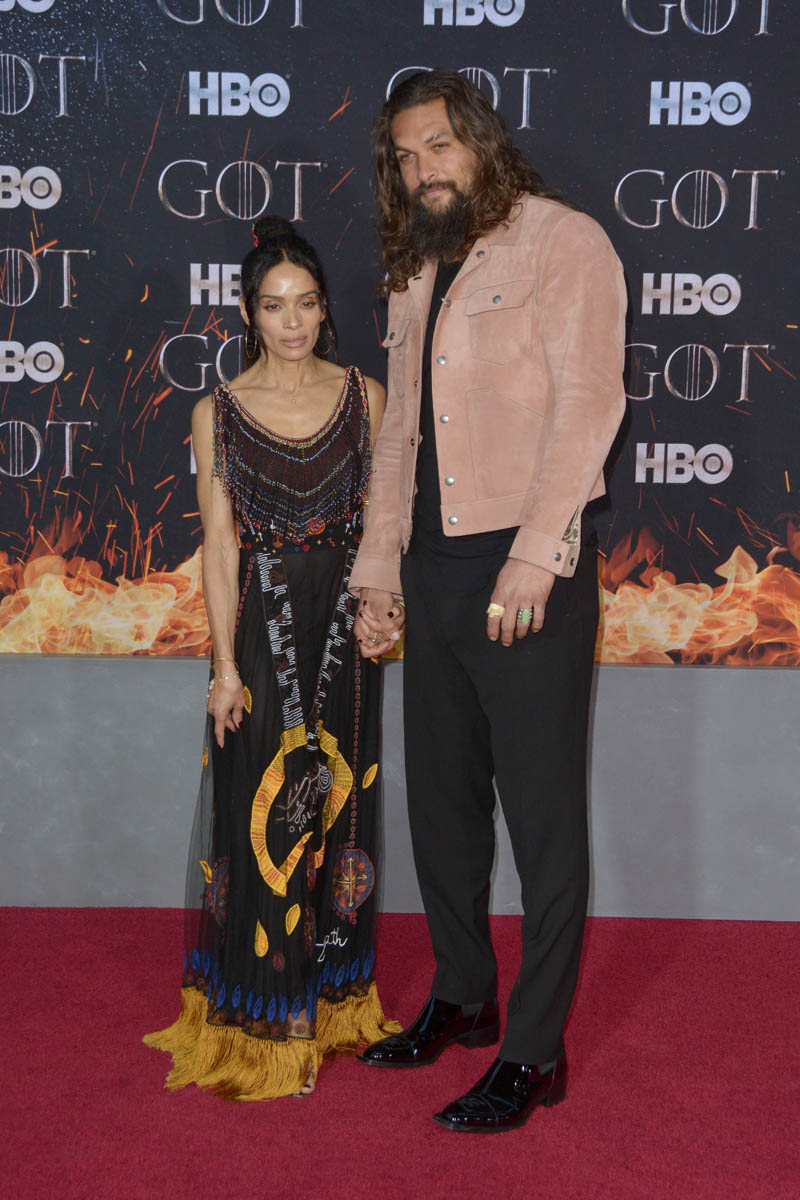 Khal Drogo returned to Game of Thrones, kind of, as Jason Momoa turned out for the Game of Thrones premiere. He came with Lisa Bonet, because everyone’s favorite couple is contractually required to appear on all red carpets together. Sadly, they did not color coordinate this time, and there was no matching velvet scrunchie for Momoa. But Lisa Bonet did show up in a cape, and Momoa is wearing a pink suede(???) jacket, so they’re still appropriately sartorially interesting, and incredibly hot standing next to one another.