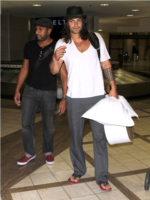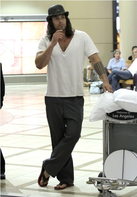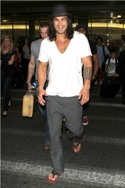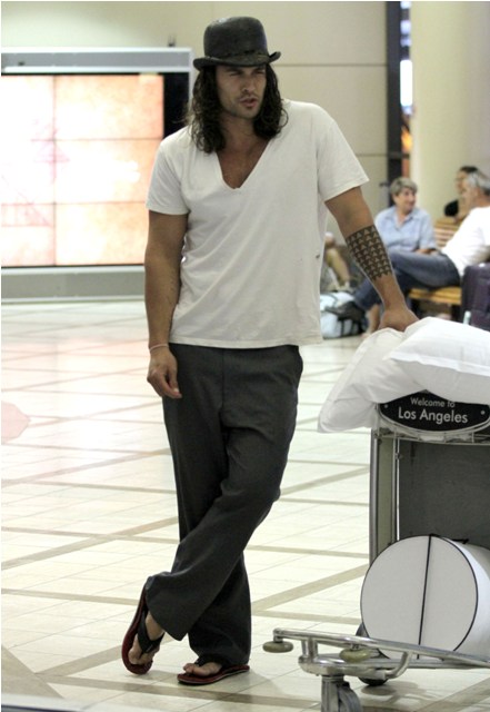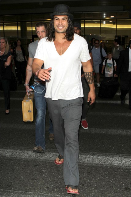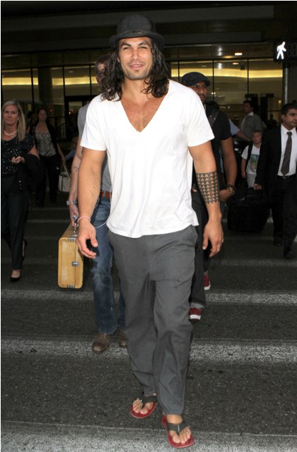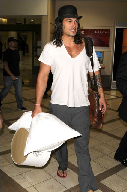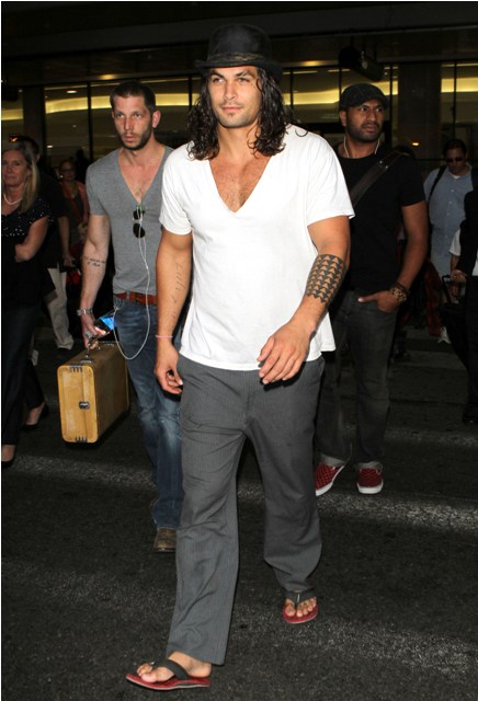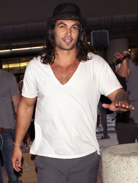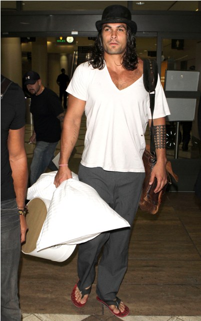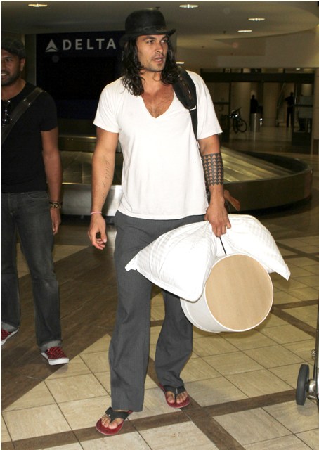 Jason Momoa arrived at LAX yesterday, in one hand a pillow, in the other a hatbox which...to me this is amazing. That he wanted to wear a hat so badly on his flight but didn’t want to get it crushed during the flight so he went to the trouble to carry a hat box. I’ve flown with a hat before. And that has always been my dilemma. Where the f-ck do I put it while I’m sleeping with my mouth open? Now I fly economy unless I get an upgrade and upgrades are never guaranteed and don’t happen all that often. In business class you have a lot more space, definitely a little corner to protect a hat. Jason evidently felt he needed something a little more sturdy. Or maybe the hatbox is for something else entirely. A much more important hat. Either way, I’m kind of obsessed. But that just may be a part of my ongoing obsession with how celebrities travel, specifically in the way of their baggage.