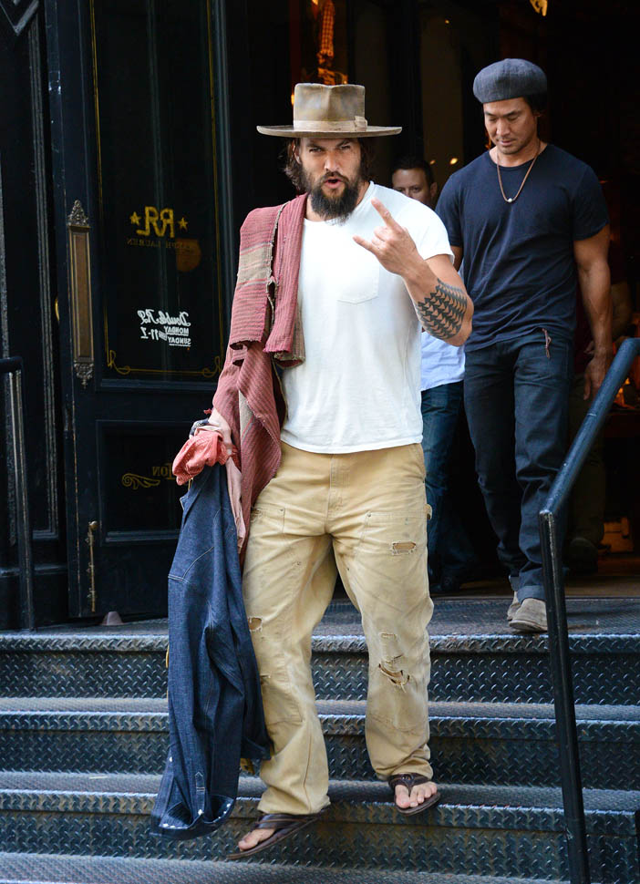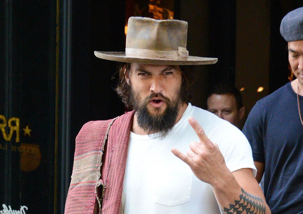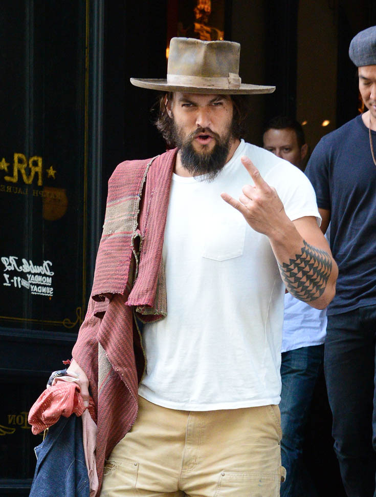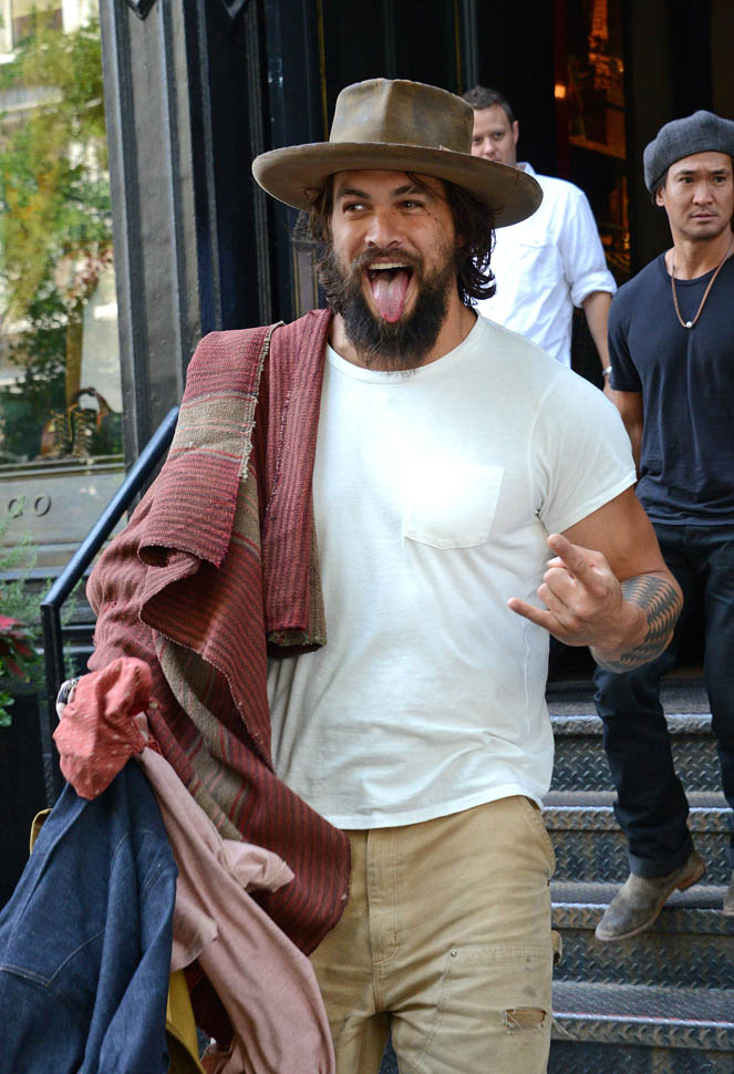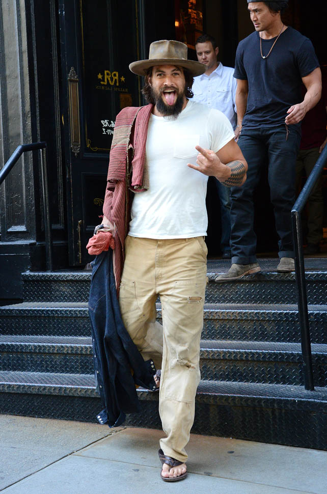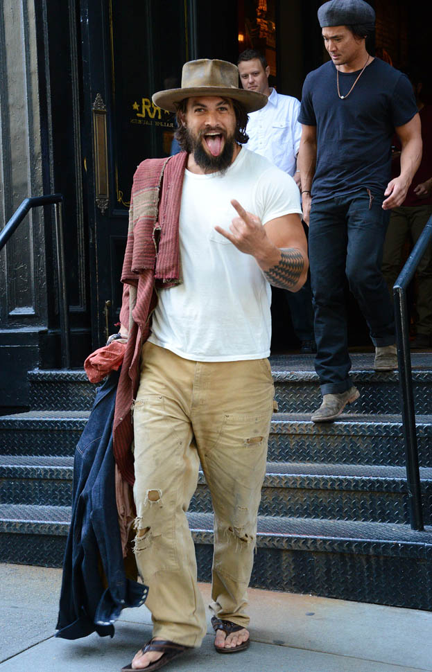 Normally a guy behaving like this, with the hat and the fingers and the tongue, I’d be skeeved. But…it’s Jason Momoa. Actually it’s more Khal Drogo. Like if Khal Drogo lived in 2014 New York City, don’t you think he’d be exiting like this? And that’s weird for me. Normally I’m not into the ragey roaring dudes. But as Laura just said backstage at The Social, “Oh yeah, you in your loin cloth, I’m in”. See, he doesn’t even need to be in the loin cloth. Ripped khakis are OK too. That’s some primal sh-t right there.