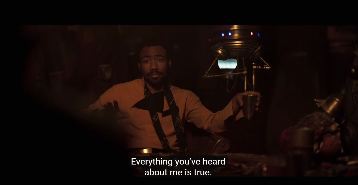 Which brings us to: “Better buckle up, baby.” Lando Calrissian, however, IS interesting. It’s not just Glover’s charisma and those sweet space capes, it’s what this trailer sets up. Lando is the “best smuggler around”. At some point, we know he’s going to lose the Millennium Falcon to Han. Then, he turns around and wins Cloud City in a bet. This is a journey! This is growth! Lando goes from criminal to responsible administrator of a large mining colony. WHY aren’t we watching that movie? You know, the one with an actual character arc.