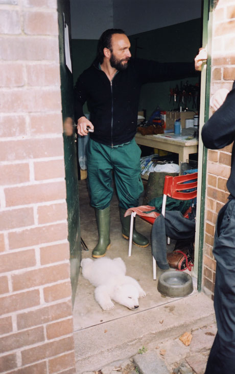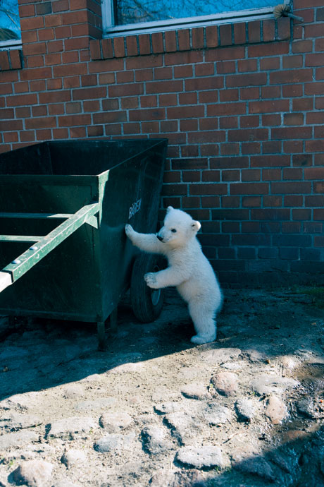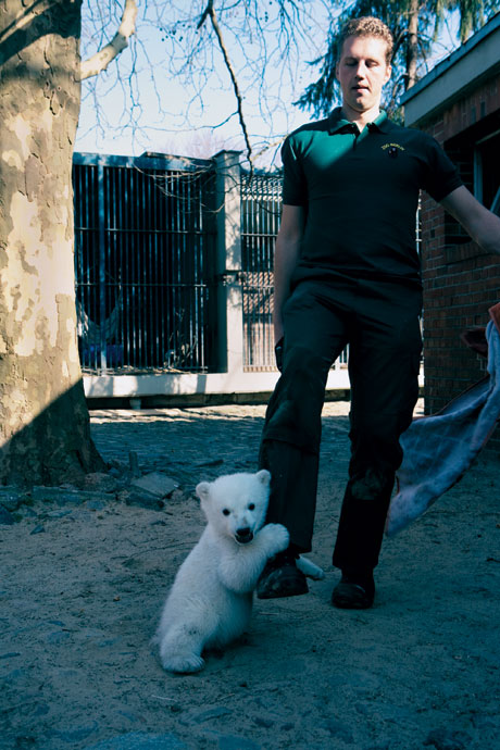 They were shot separately by Annie Leibovitz, put together for the cover, and these are a couple of the adorable outtakes from Knut’s shoot. I like the one where he’s crashed out at his keeper’s feet. Keeper"s name is Thomas. Thomast slept with the little guy in a cage for weeks. Which is what makes him a sexy beast, even if he does look like a pervy freak.
