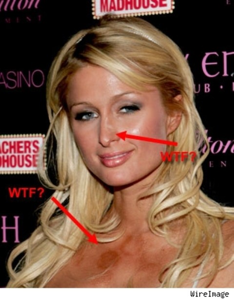 Bitch has never looked better. Here’s Paris at her birthday party on Saturday, wonky eye perhaps blinding her to the unblended foundation left across her nose, and a few curious marks splashed across her chest. Is Paris cupping? You may recall, my Gwyneth caused a minor stir a few years ago when she showed up at movie premiere with a bare back (attached) emblazoned with strange circles – the result of a procedure called Cupping…some kind of fancy ass detox “asian” cleanse. My mother just called, I asked her about, in between her dictating to me her long list of birthday demands, and her response was… WAHHH? Hurff! (it’s like a guttural “huff” tinged with a Chinese accent – try it). In her words: Why you need the cupps-ing when Chinese soup every day and also dried orange peel welly welly good for the lung cleaning, I dung low, famous peepoh so funny. (translation: I don’t know, famous people so funny.) She does have a point you know… But back to Paris. Paris and her stains, Paris pulling a Gwynnie? Doubt it. Damn skank was probably letting the Greek Giant hot knife off her chest. Dumb ass. TMZ